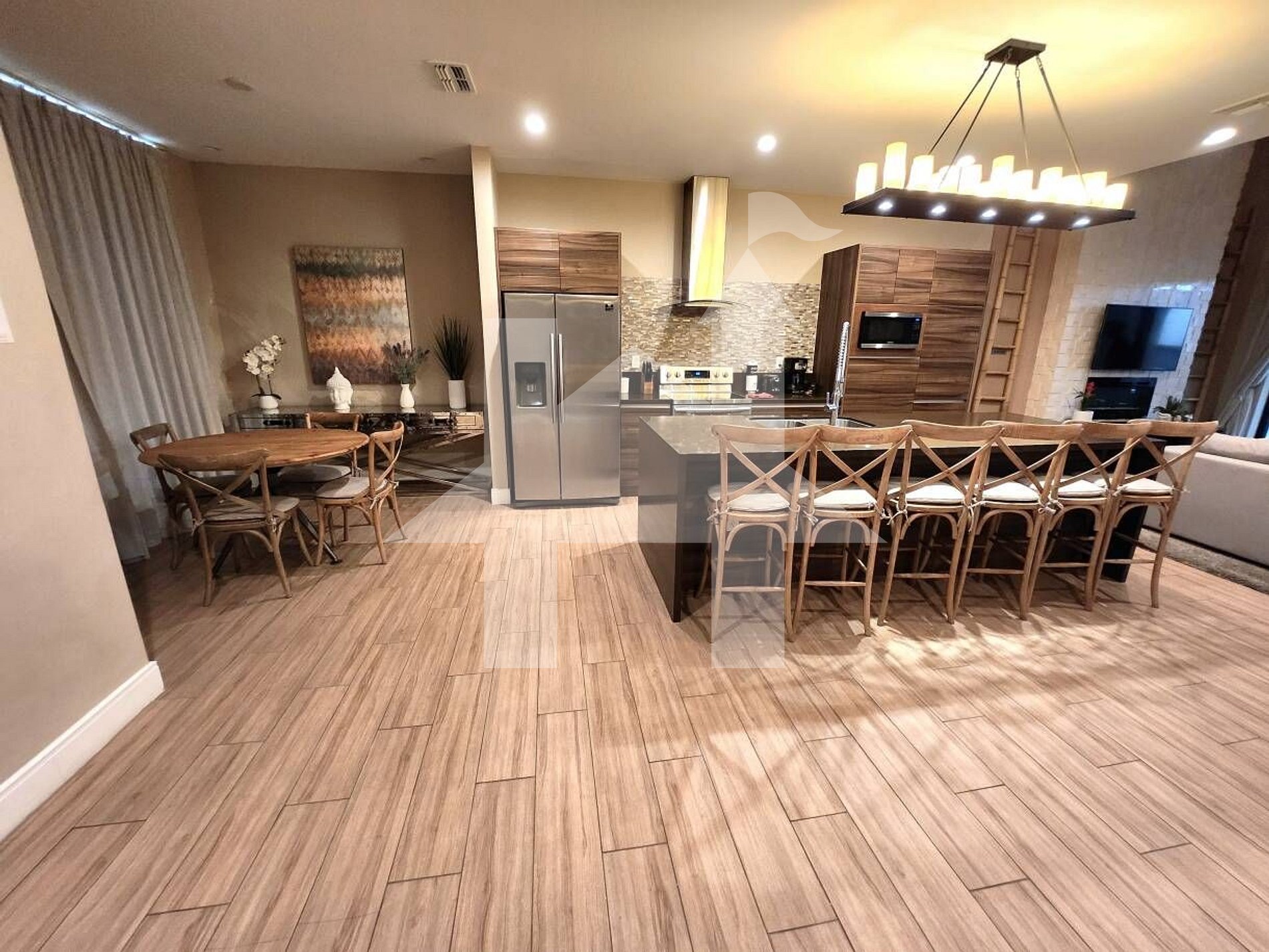 - Sala de Estar: Espaçosa, com sofás, chaise lounges, TV, lareira elétrica e teto duplo.