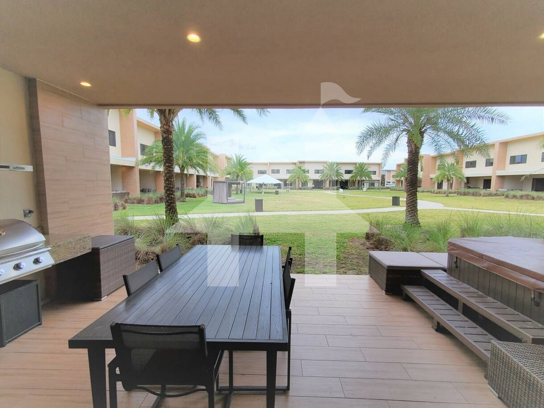 -Varanda: Grande terraço com churrasqueira, mesa com 6 cadeiras e jacuzzi.