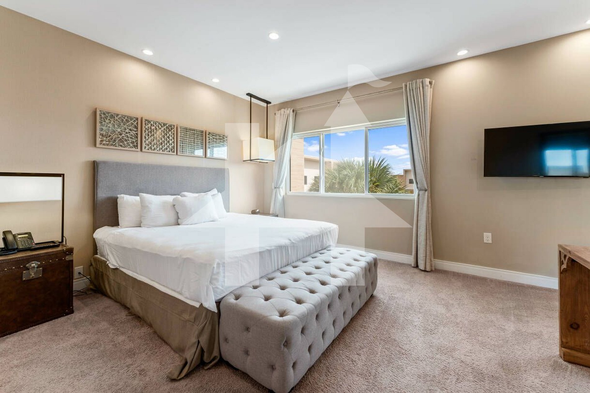 - O quarto principal com cama king, mesa de trabalho e uma chaise lounge grande.