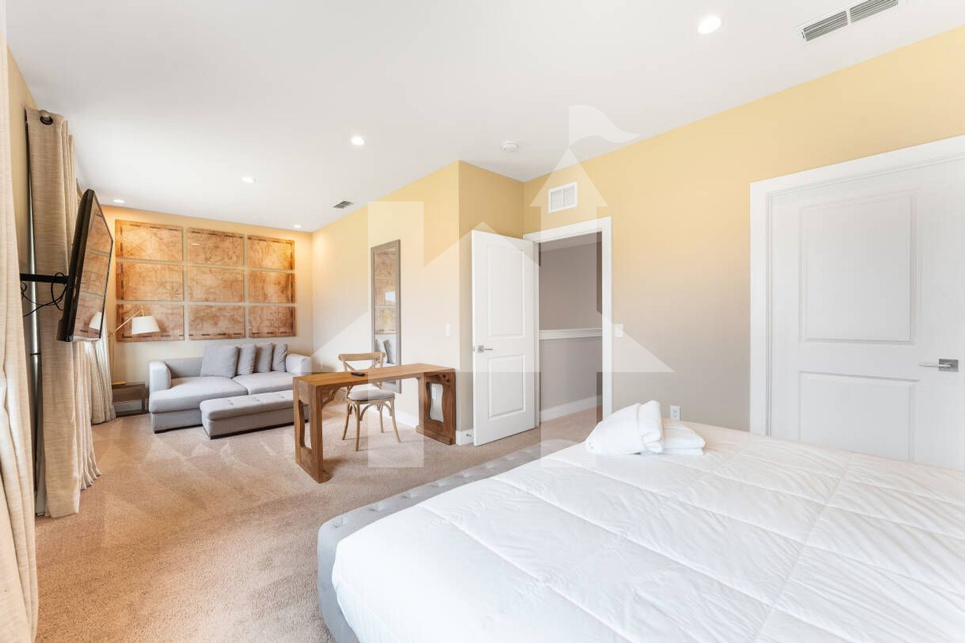 - O quarto principal com cama king, mesa de trabalho e uma chaise lounge grande.
