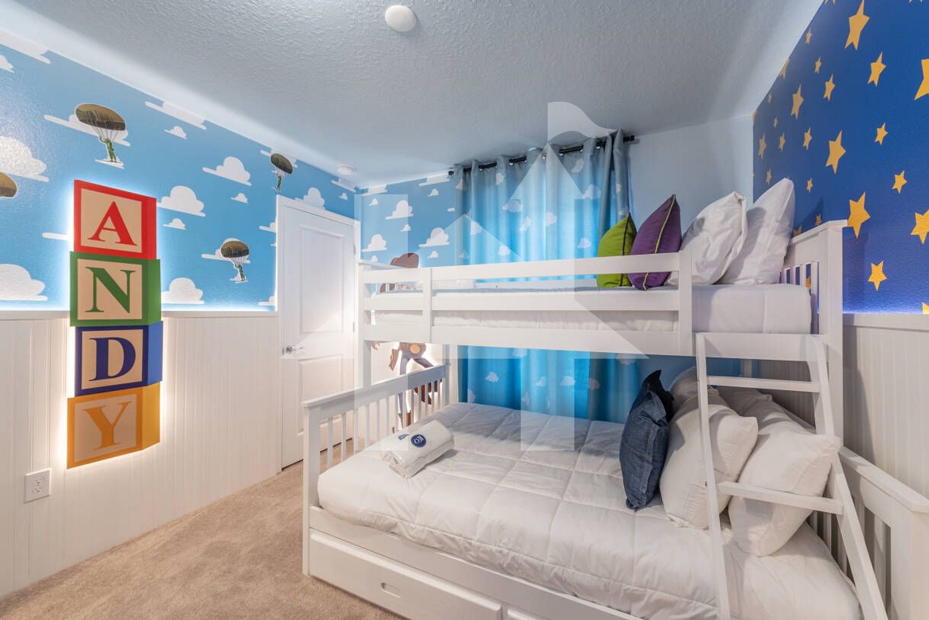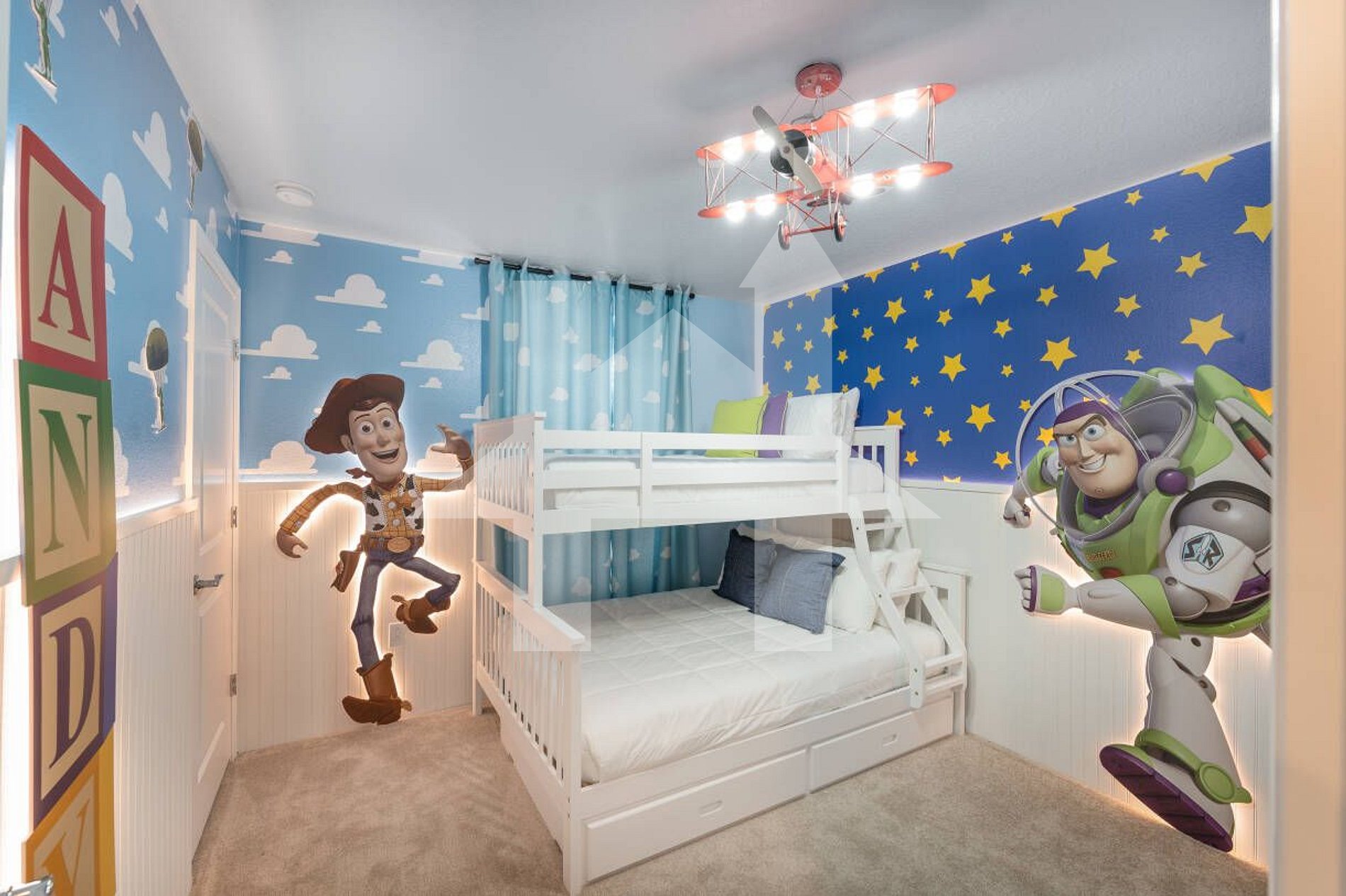 Quarto temático 2: beliche twin-over-full + cama Full, tema Toy Story