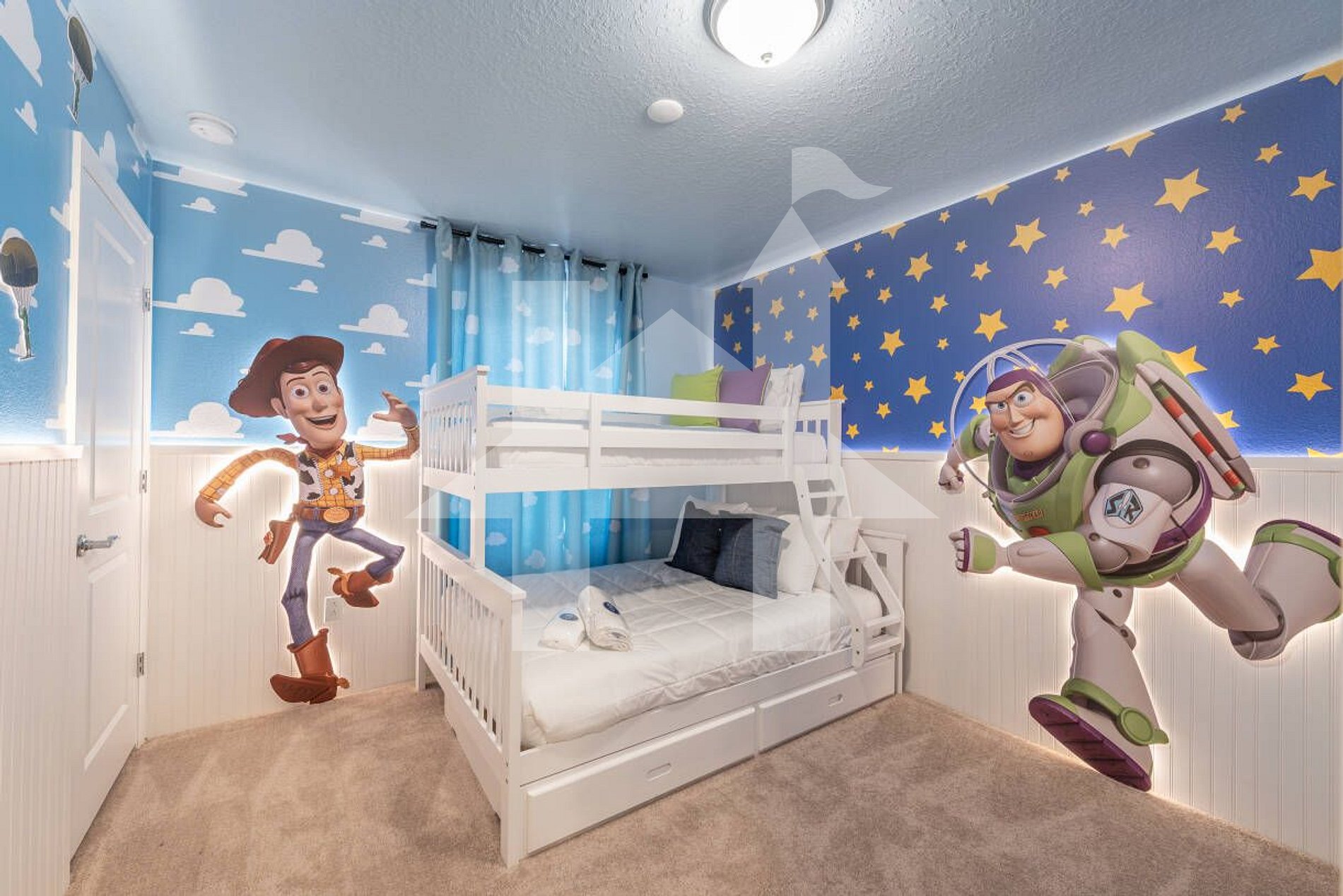 Quarto temático 2: beliche twin-over-full + cama Full, tema Toy Story