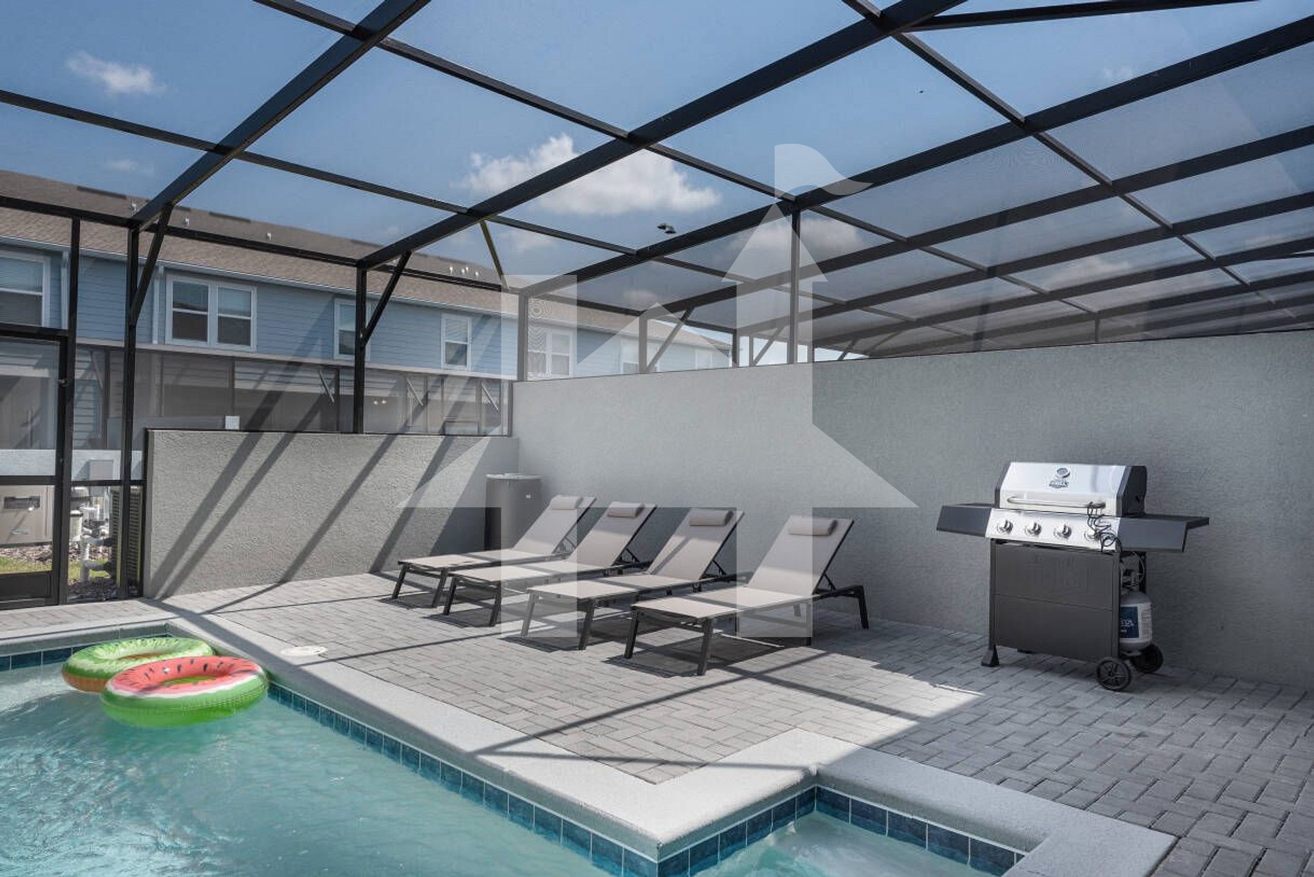 Portas de vidro se abrem para varanda coberta com mesa para 6, 4 espreguiçadeiras, churrasqueira (uso disponível mediante taxa única de US$ 100 — limpeza + reposição de gás) e piscina privativa (aquecimento opcional)