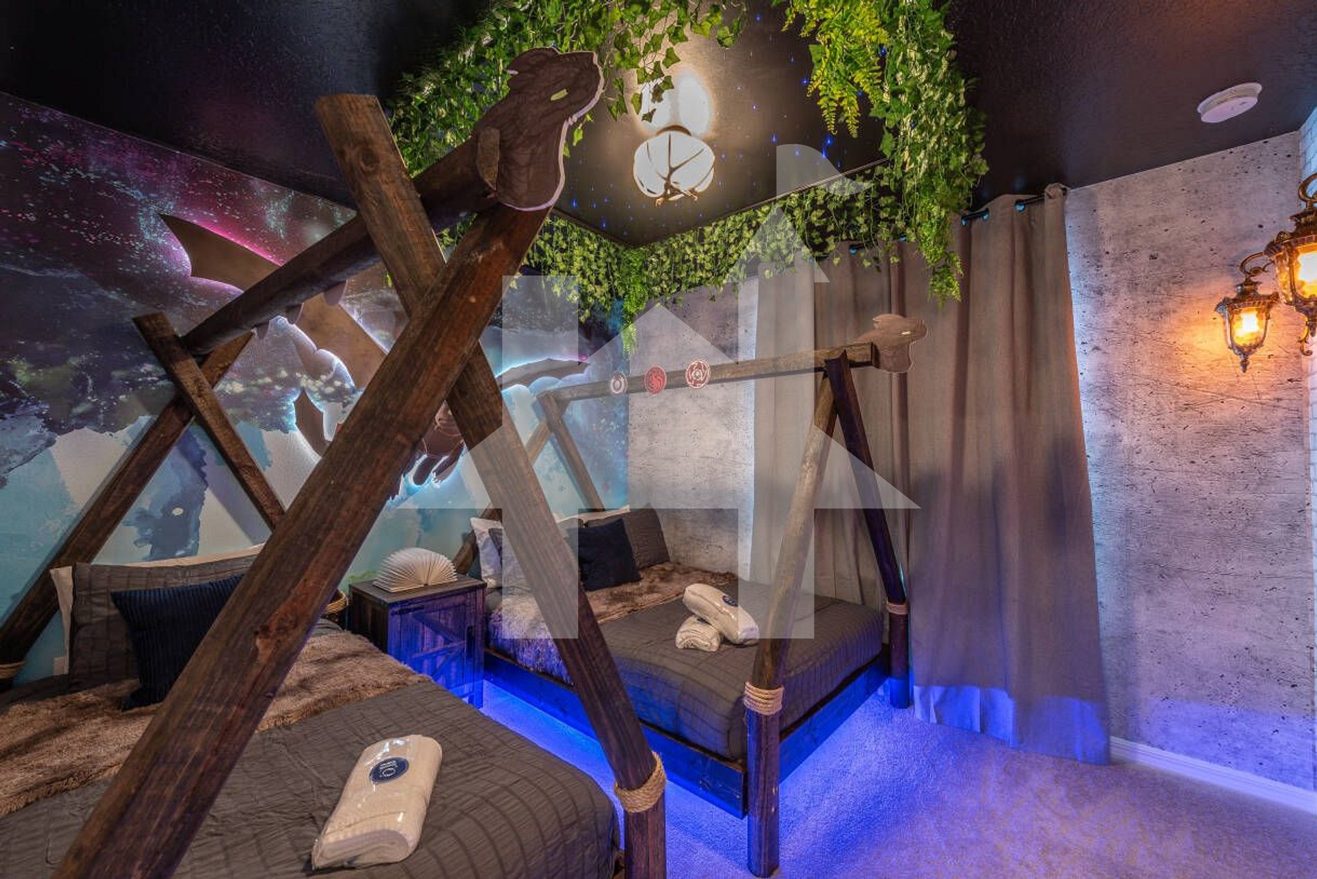 Quarto temático 1: cama Full + solteiro, TV de 43″, tema “Como Treinar o Seu Dragão”
