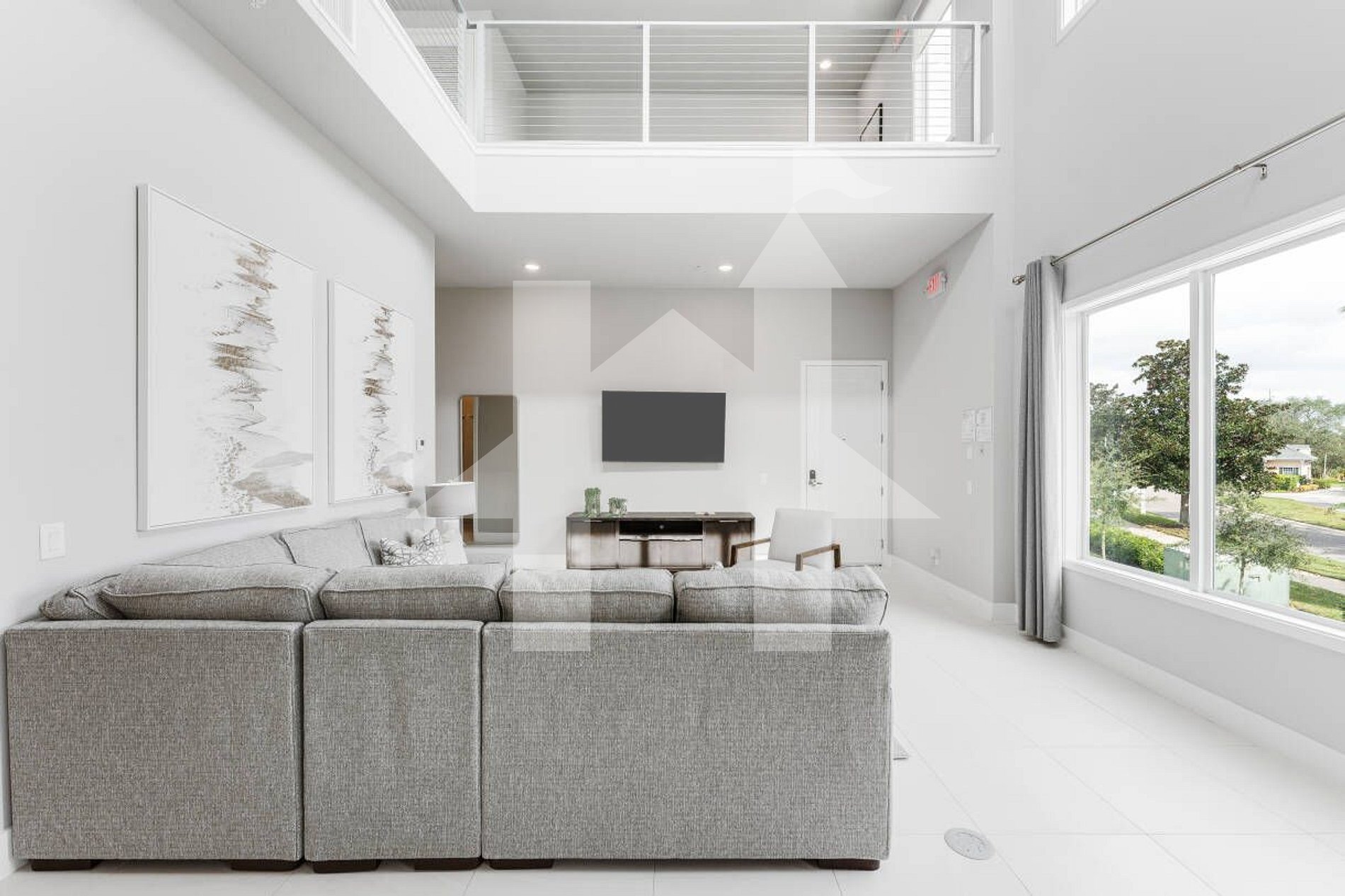Este loft moderno de dois andares está localizado no segundo piso de um prédio seguro e possui pé direito alto, decoração refinada e um layout aberto e arejado ideal para famílias e grupos. Com Smart TVs em todos os cômodos, mesa de sinuca e terraço privativo, é o cenário perfeito para relaxar após um dia nos parques.