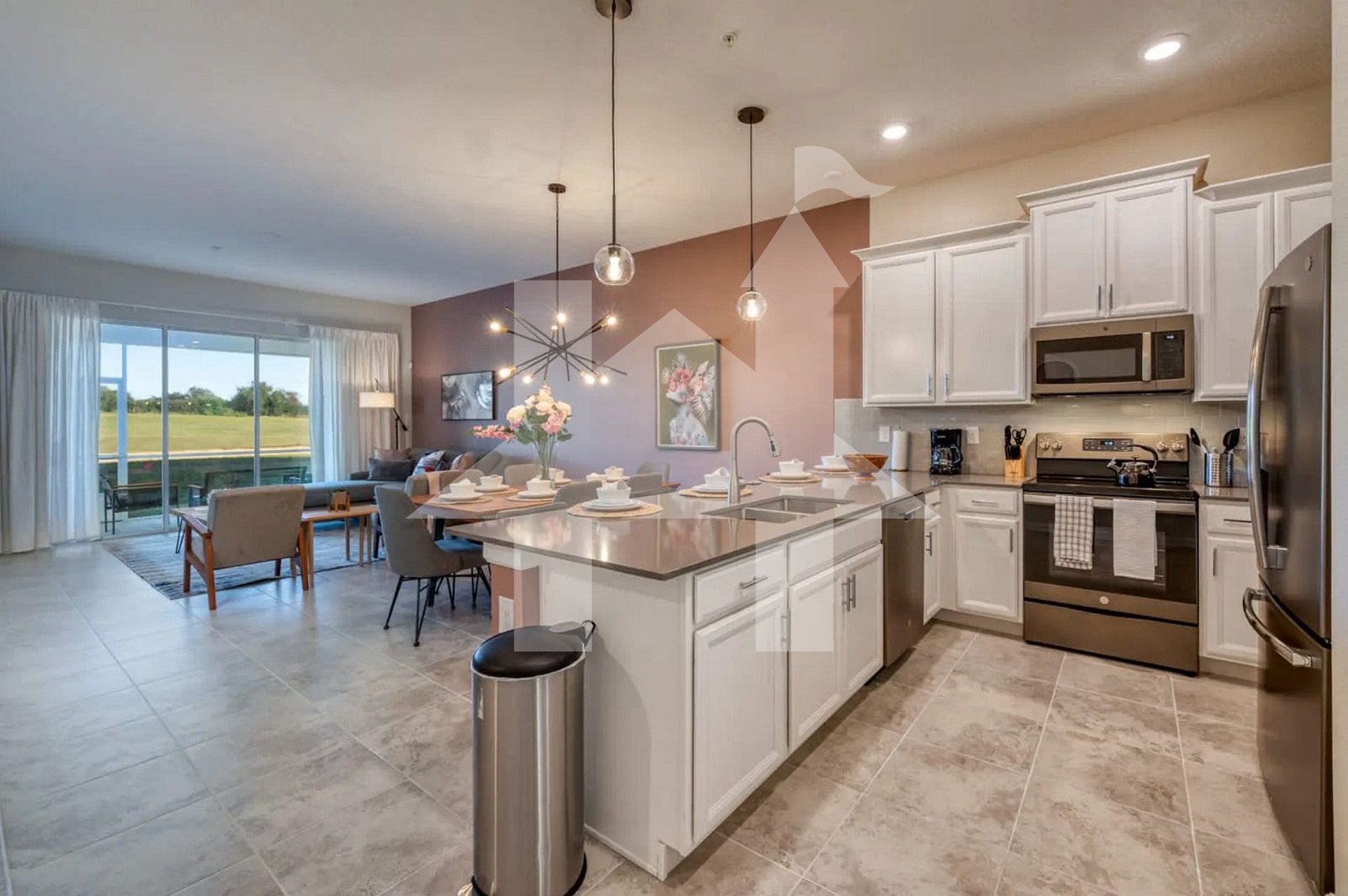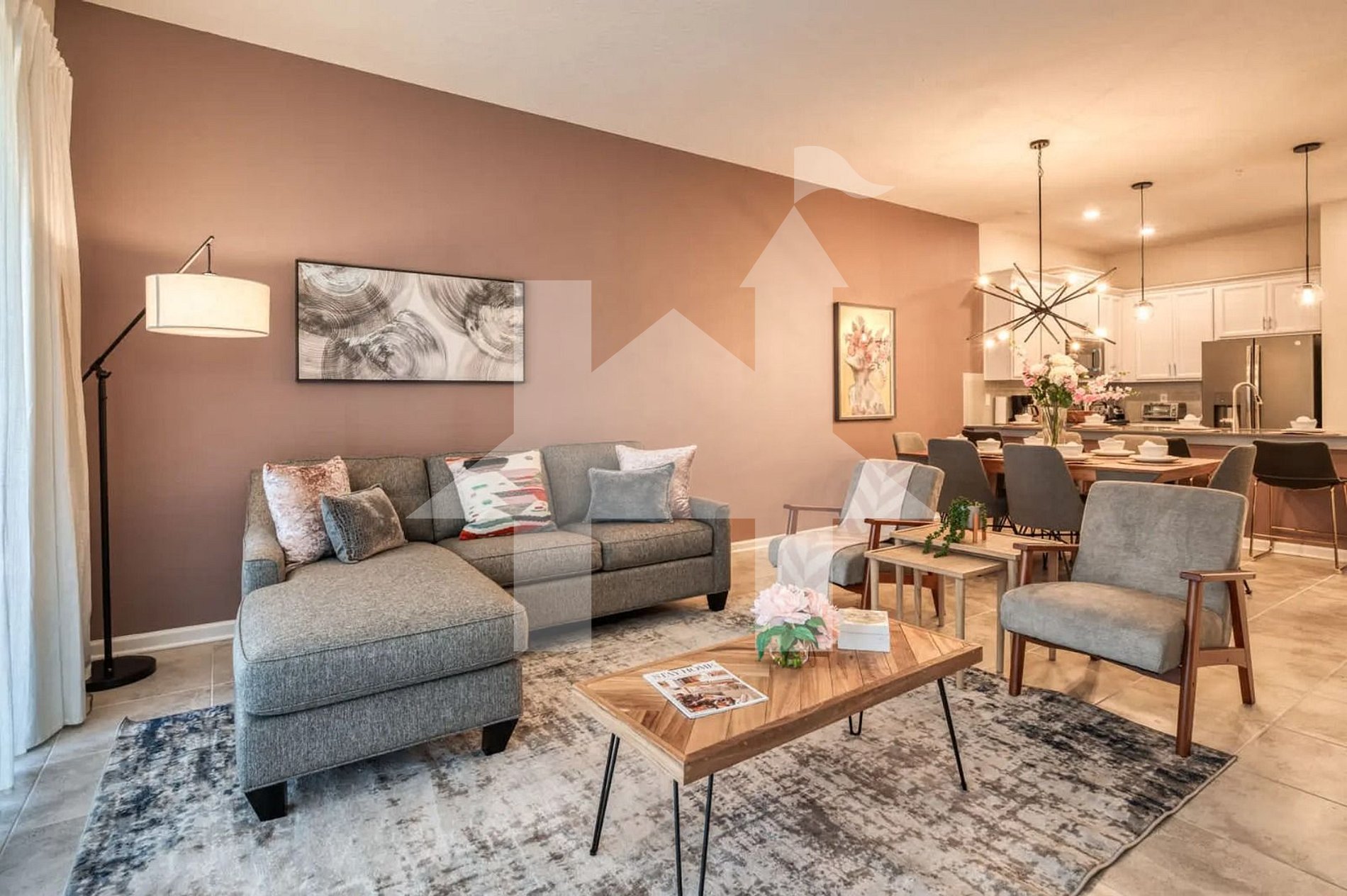 Assim que você entra, já é possível perceber o cuidado nos detalhes e a decoração moderna, que criam um ambiente acolhedor e sofisticado. O layout em conceito aberto integra a sala de estar, a sala de jantar e a cozinha, garantindo praticidade e momentos de convivência em grupo. A sala de estar dispõe de sofá confortável, Smart TV e ampla iluminação natural — ideal tanto para noites de filmes quanto para momentos de descontração após um dia nos parques.
