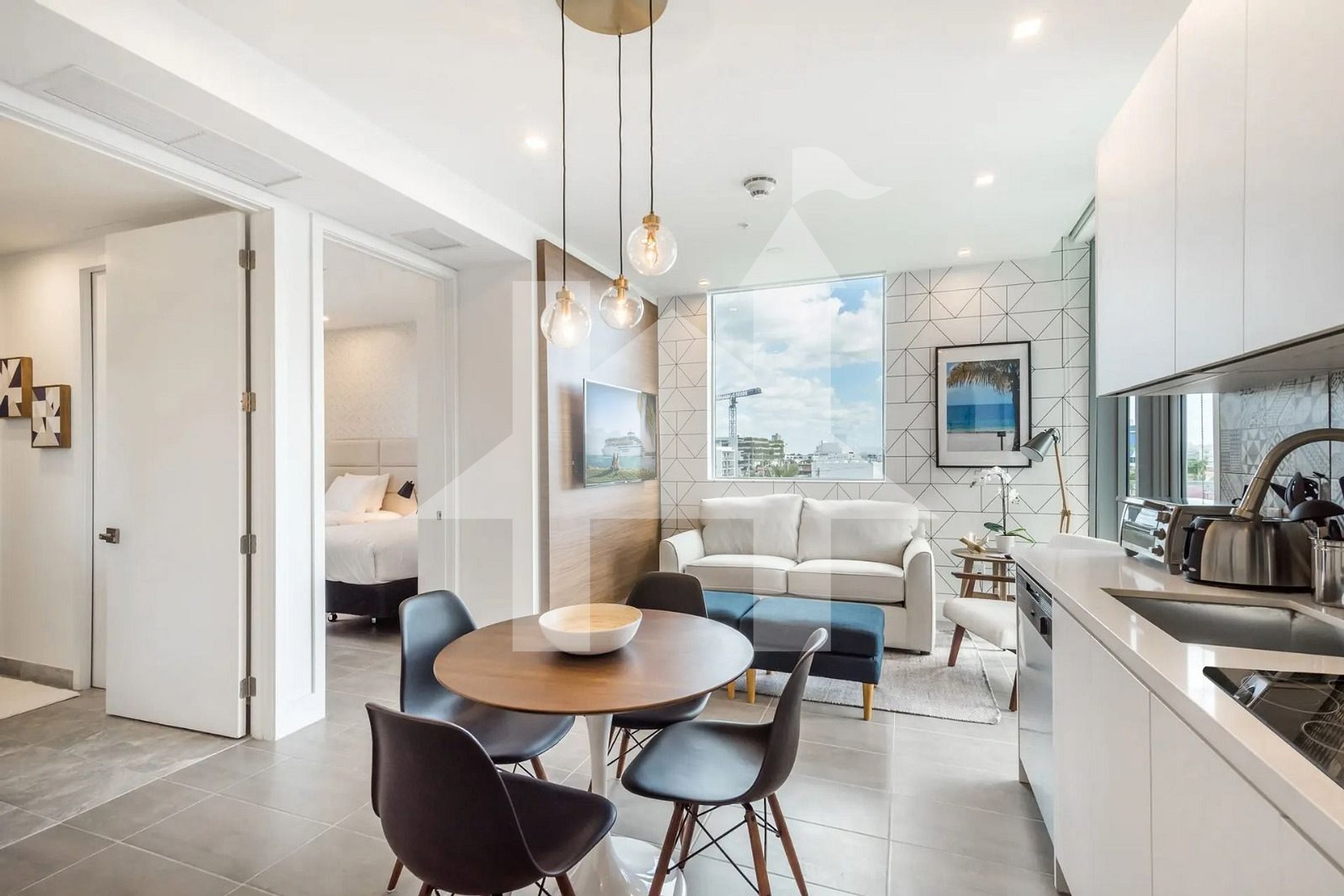 Ambiente claro e integrado que une funcionalidade e sofisticação. A sala conta com sofá-cama e smart TV, e a varanda é perfeita para relaxar e sentir o clima vibrante de Miami. A cozinha está equipada com tudo que você precisa para preparar refeições ou cafés rápidos antes de explorar a cidade.