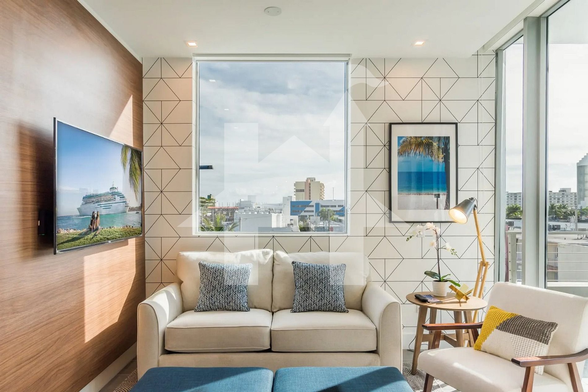 Localizado no coração de South Beach, este apartamento estiloso de 2 quartos e 2 banheiros está a apenas 5 minutos a pé da praia. Ideal para famílias, casais ou viagens de trabalho, acomoda até 5 pessoas com conforto moderno e design elegante.
