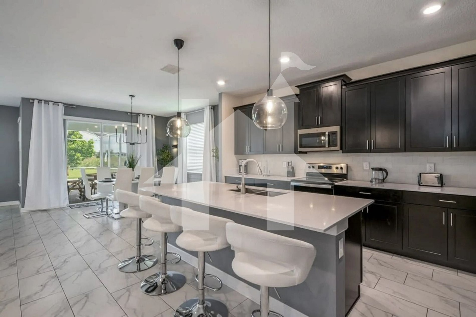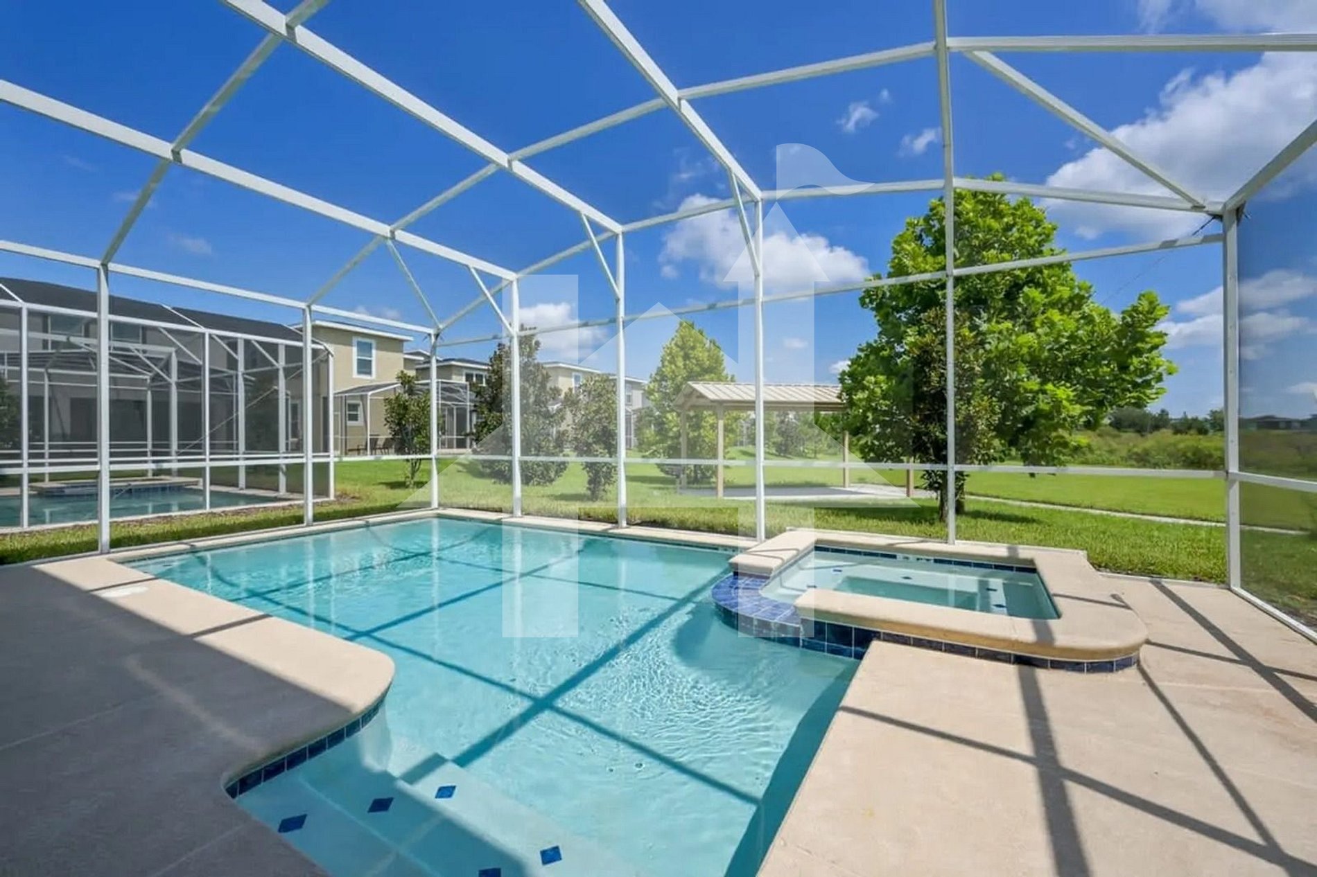 Na área externa, a piscina privativa aquecível (serviço disponível mediante taxa adicional) oferece o cenário perfeito para relaxar após um dia de diversão. Seja aproveitando o sol durante o dia ou mergulhando à noite sob o céu da Flórida, este espaço proporciona tranquilidade e conforto. Para quem deseja uma experiência ainda mais completa, a casa conta com churrasqueira (serviço disponível mediante taxa adicional) — ideal para refeições ao ar livre com a família ou amigos.