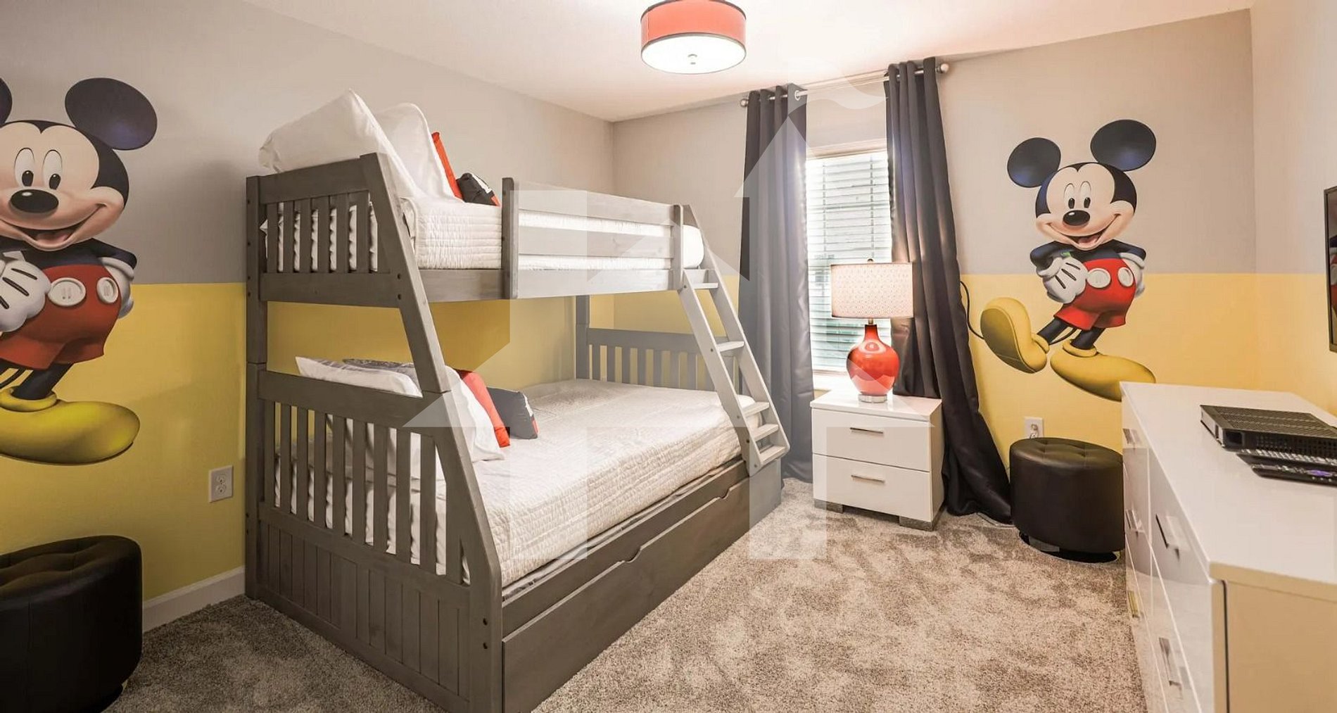 Quarto 3 (2º andar – tema Mickey): 1 beliche (1 cama de casal + 2 camas de solteiro)