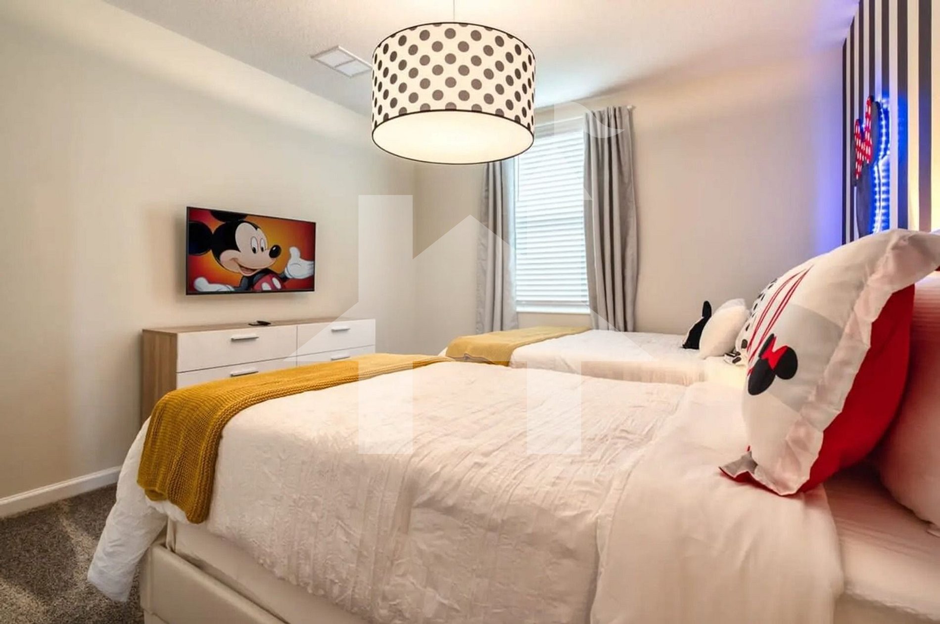 -Quarto Temático do Mickey: Cama de casal + solteiro, decoração lúdica, smart TV.
