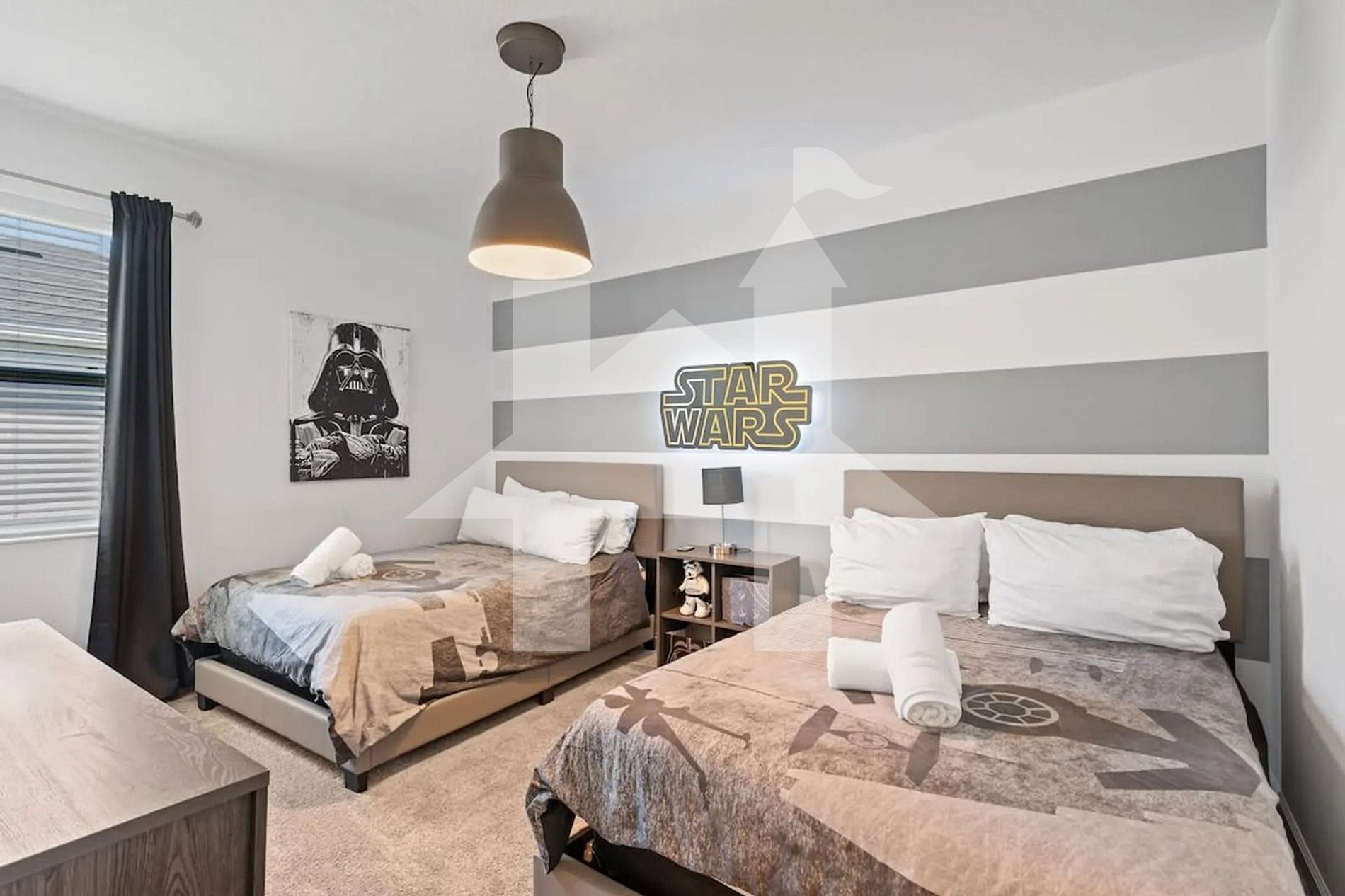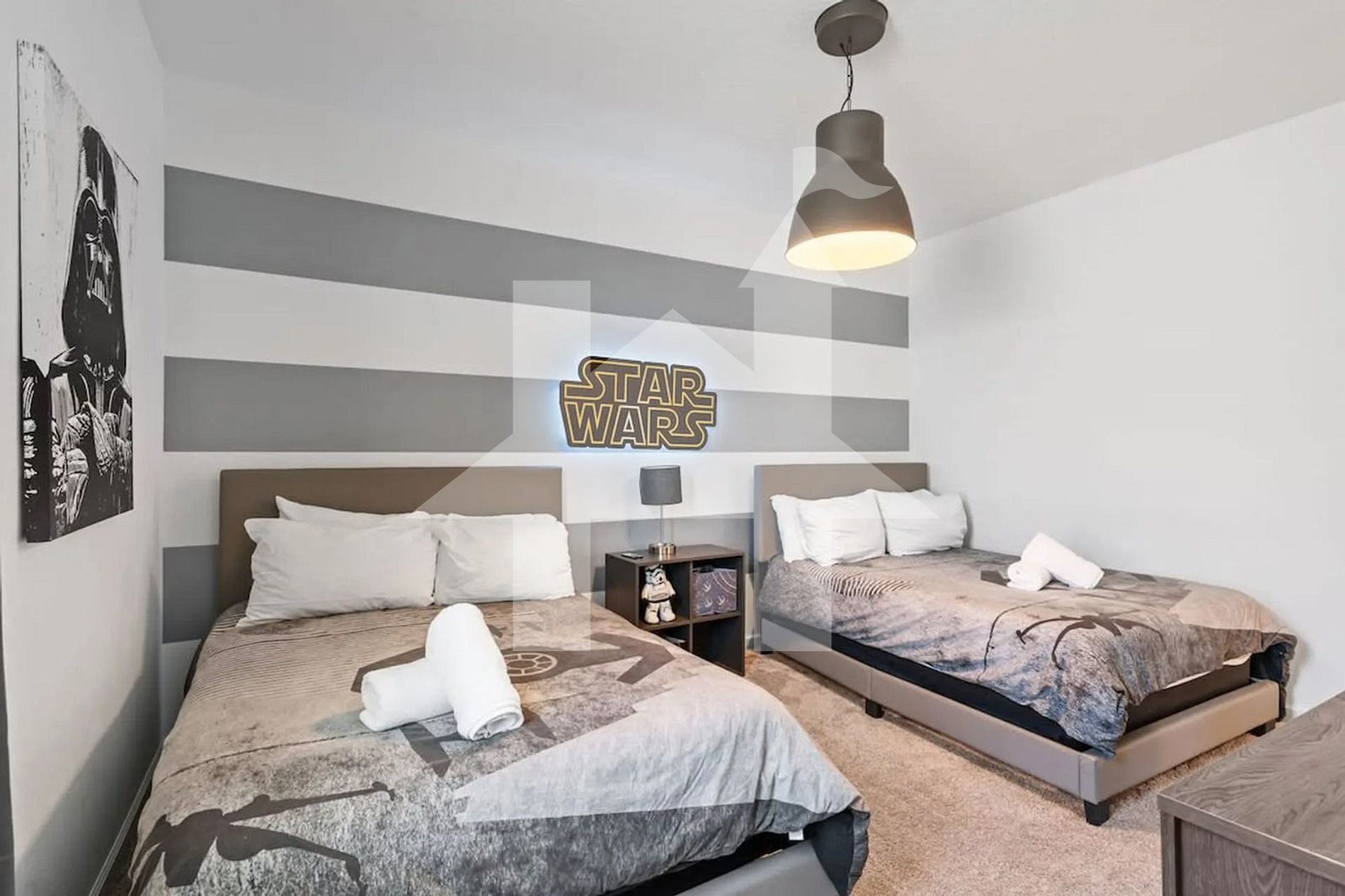 Quarto Temático Star Wars (4 hóspedes): 2 camas de casal em um ambiente divertido e imersivo, ideal para crianças, adolescentes ou até adultos fãs da saga. Divide banheiro moderno com o quarto 3.