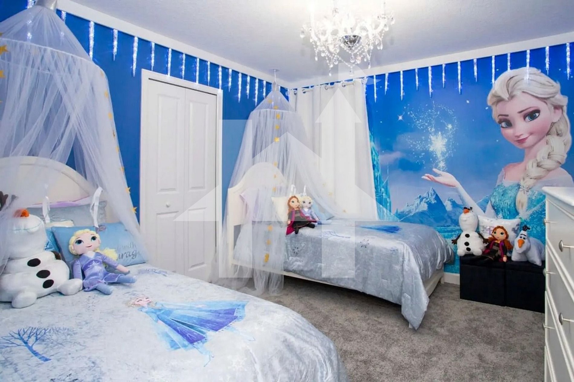 Quarto Frozen – 2 camas de solteiro em um ambiente inspirado no reino gelado.