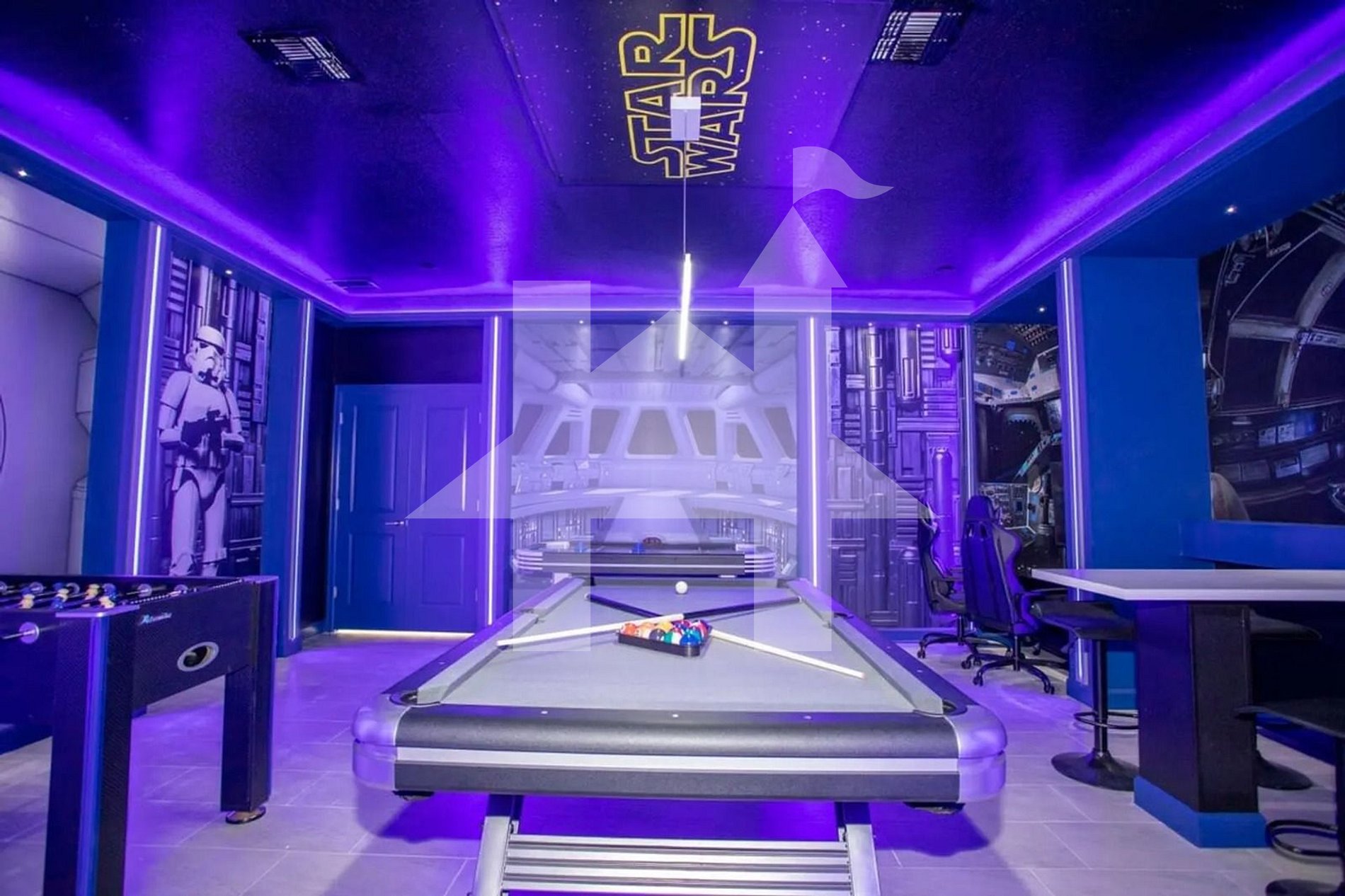 Viva o luxo nesta casa de 6 quartos e 6 banheiros no Storey Lake Resort, a apenas 10 minutos da Disney. Curta quartos temáticos como Frozen e Toy Story, sala de jogos inspirada em Star Wars e cinema com tema do Mickey. Relaxe na piscina privativa aquecida ou aproveite as comodidades do resort, como piscina pirata, lazy river, academia e mini-golfe. Wi-Fi, estacionamento e muito mais incluídos. Ideal para famílias que buscam conforto, diversão e estilo em Orlando!