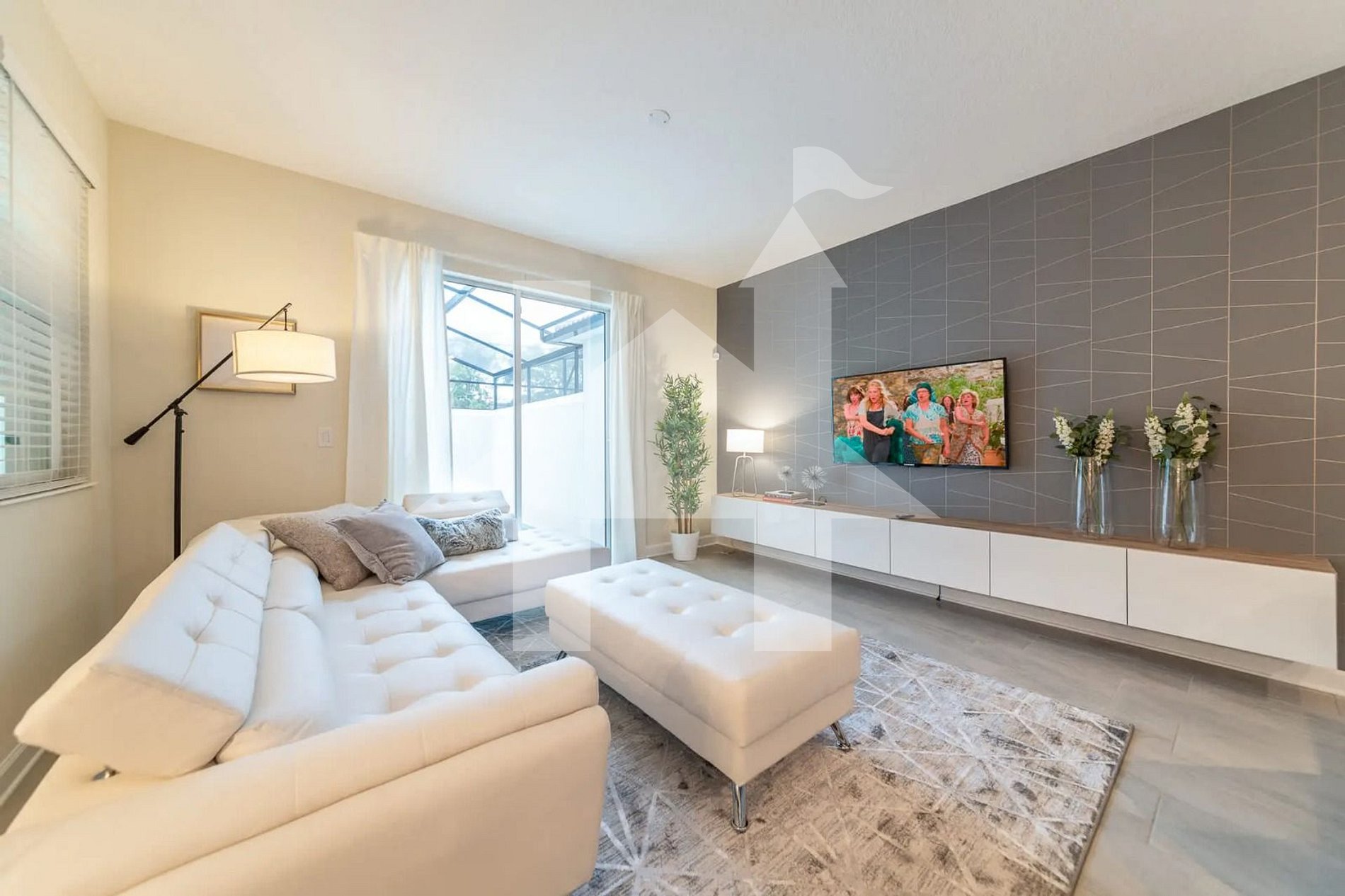 O ambiente principal integra uma cozinha totalmente equipada, mesa de jantar para refeições em grupo e uma sala de estar aconchegante – ideal para noites de filmes ou momentos de descontração em família. Do lado de fora, desfrute do pátio privativo com piscina aquecível (serviço extra), perfeito para relaxar ao sol da Flórida ou descansar após um dia nos parques.