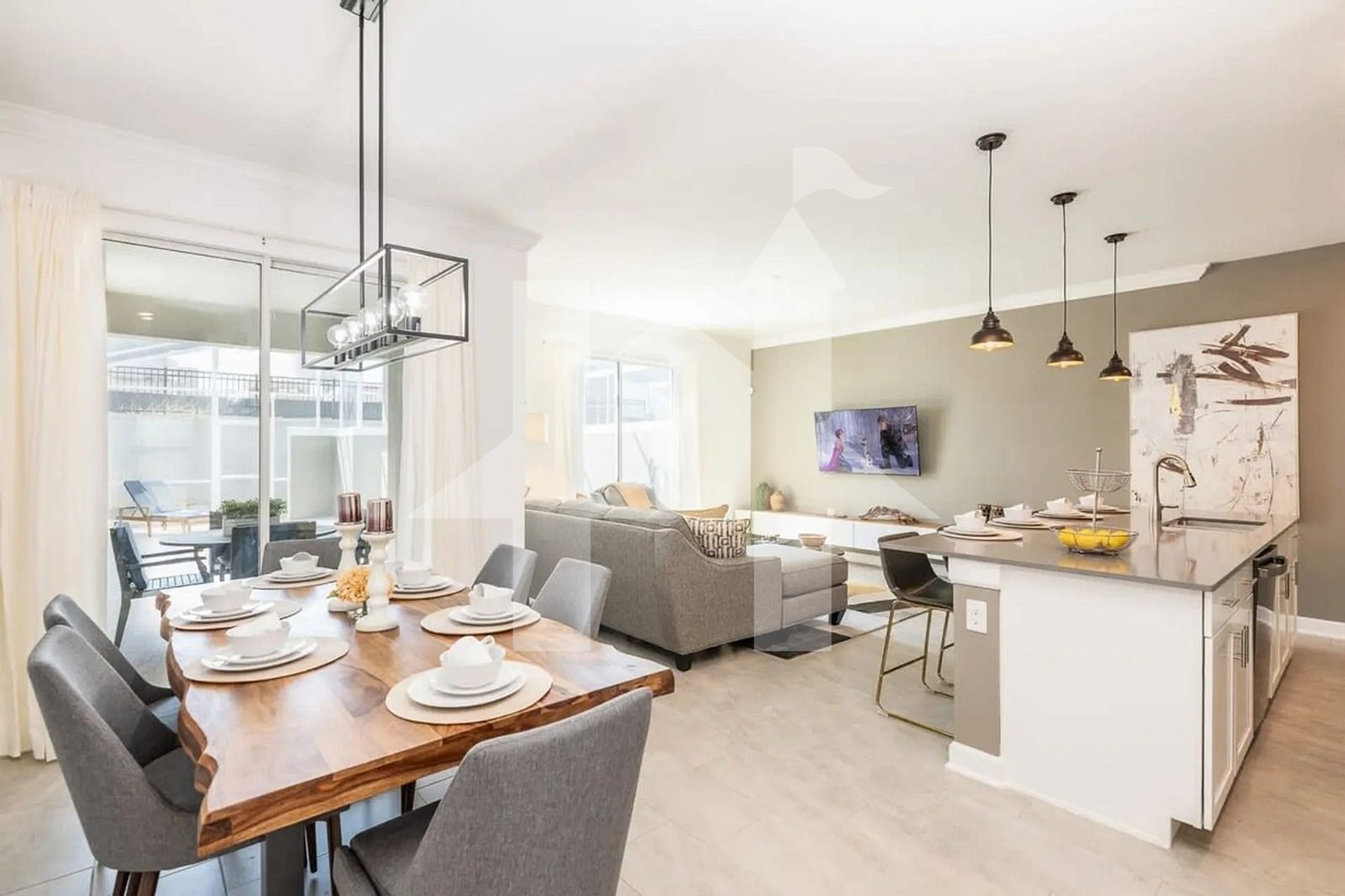 Entre em um elegante espaço de conceito aberto, onde a sala de estar se integra harmoniosamente à área de jantar e à cozinha completa — perfeita para refeições em família ou momentos de descontração. Do lado de fora, aproveite o pátio privativo com piscina aquecida (opcional), ideal para relaxar sob o sol da Flórida ou curtir um mergulho à noite.