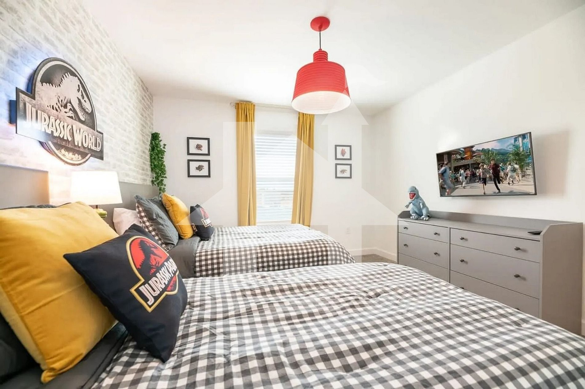 A casa conta com duas suítes king: uma no térreo com banheiro adjacente e outra no andar superior como suíte master. As crianças e fãs de quartos temáticos vão adorar os ambientes inspirados na Disney Mickey Mouse e no Jurassic Park, cada um com uma cama de casal e uma de solteiro, proporcionando diversão e imersão.