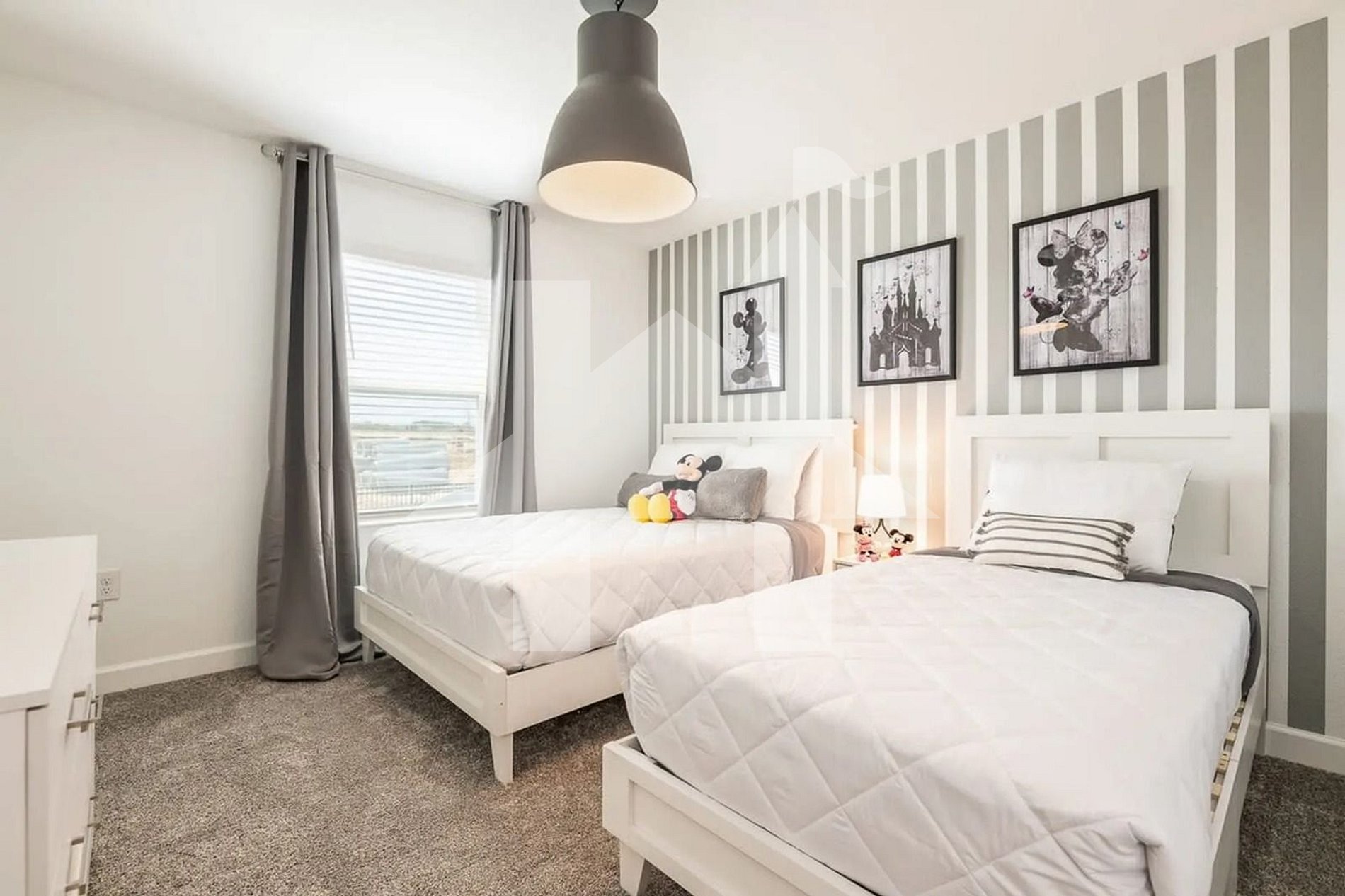 A casa conta com duas suítes king: uma no térreo com banheiro adjacente e outra no andar superior como suíte master. As crianças e fãs de quartos temáticos vão adorar os ambientes inspirados na Disney Mickey Mouse e no Jurassic Park, cada um com uma cama de casal e uma de solteiro, proporcionando diversão e imersão.