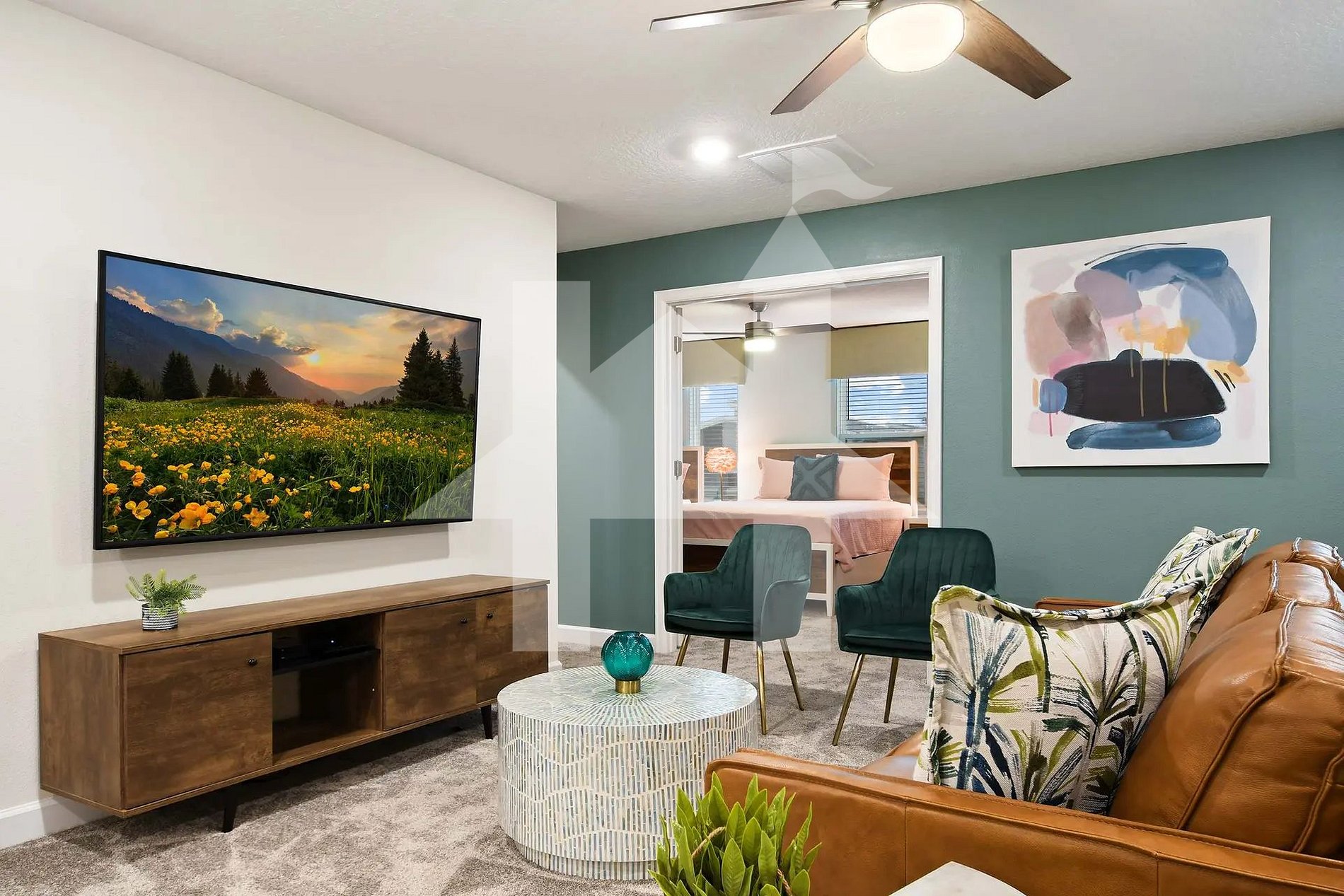 A ampla sala de estar, com decoração moderna e acolhedora, se integra à sala de jantar e à cozinha americana completamente equipada. Esse ambiente aberto favorece a convivência do grupo, ideal para preparar refeições juntos, conversar ou simplesmente relaxar após um dia nos parques. A cozinha dispõe de eletrodomésticos de alta qualidade, incluindo geladeira dupla, forno, micro-ondas, lava-louças, cafeteira e utensílios completos para atender a todas as necessidades dos hóspedes.