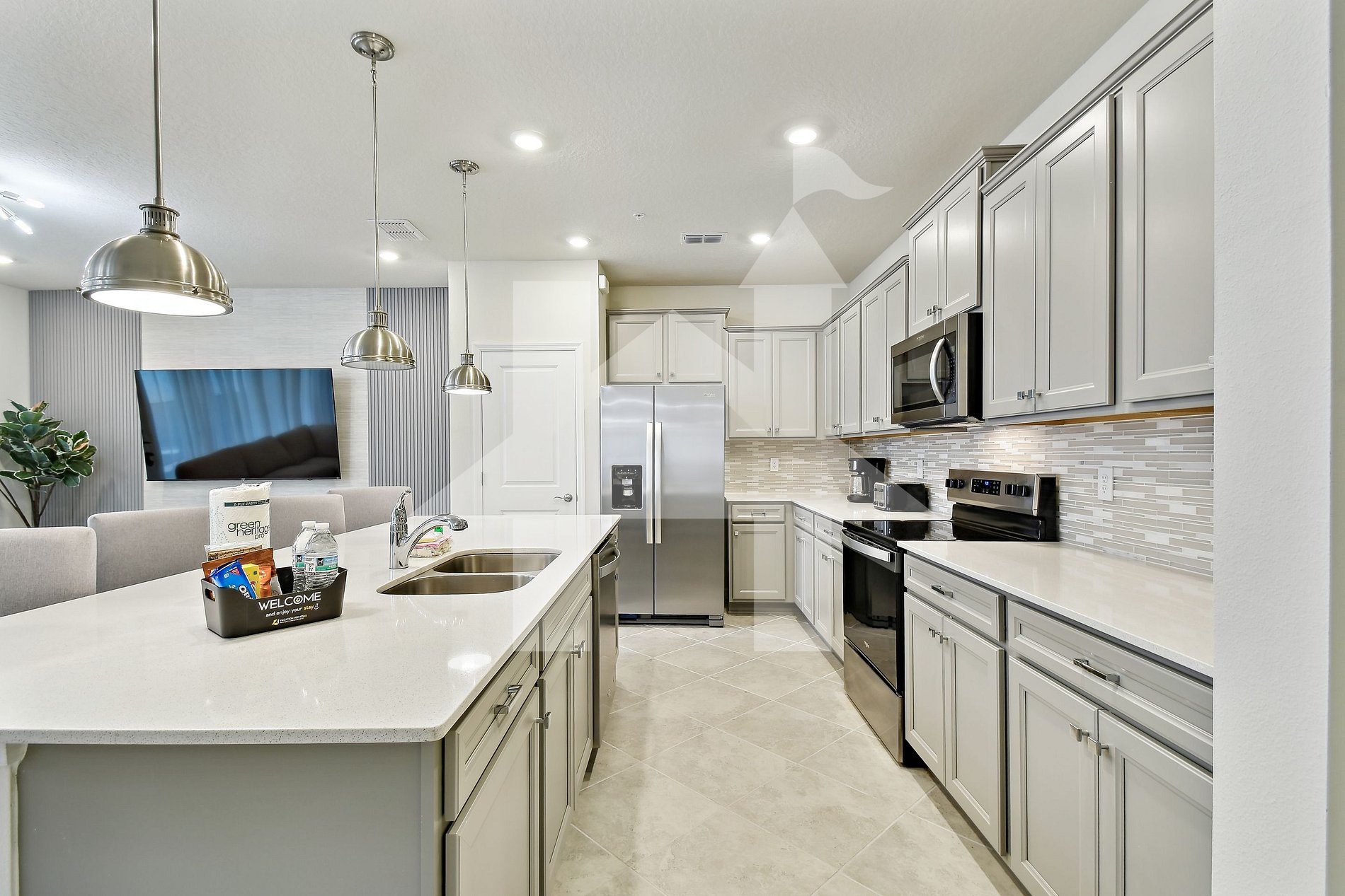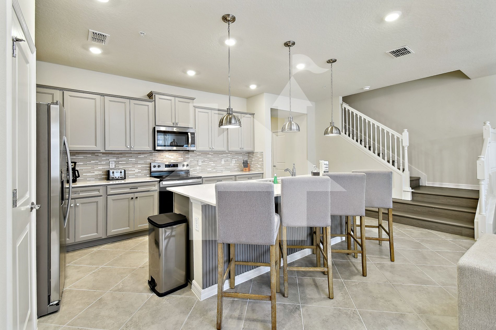 -Cozinha completa com eletrodomésticos modernos e bancada para refeições rápidas.
