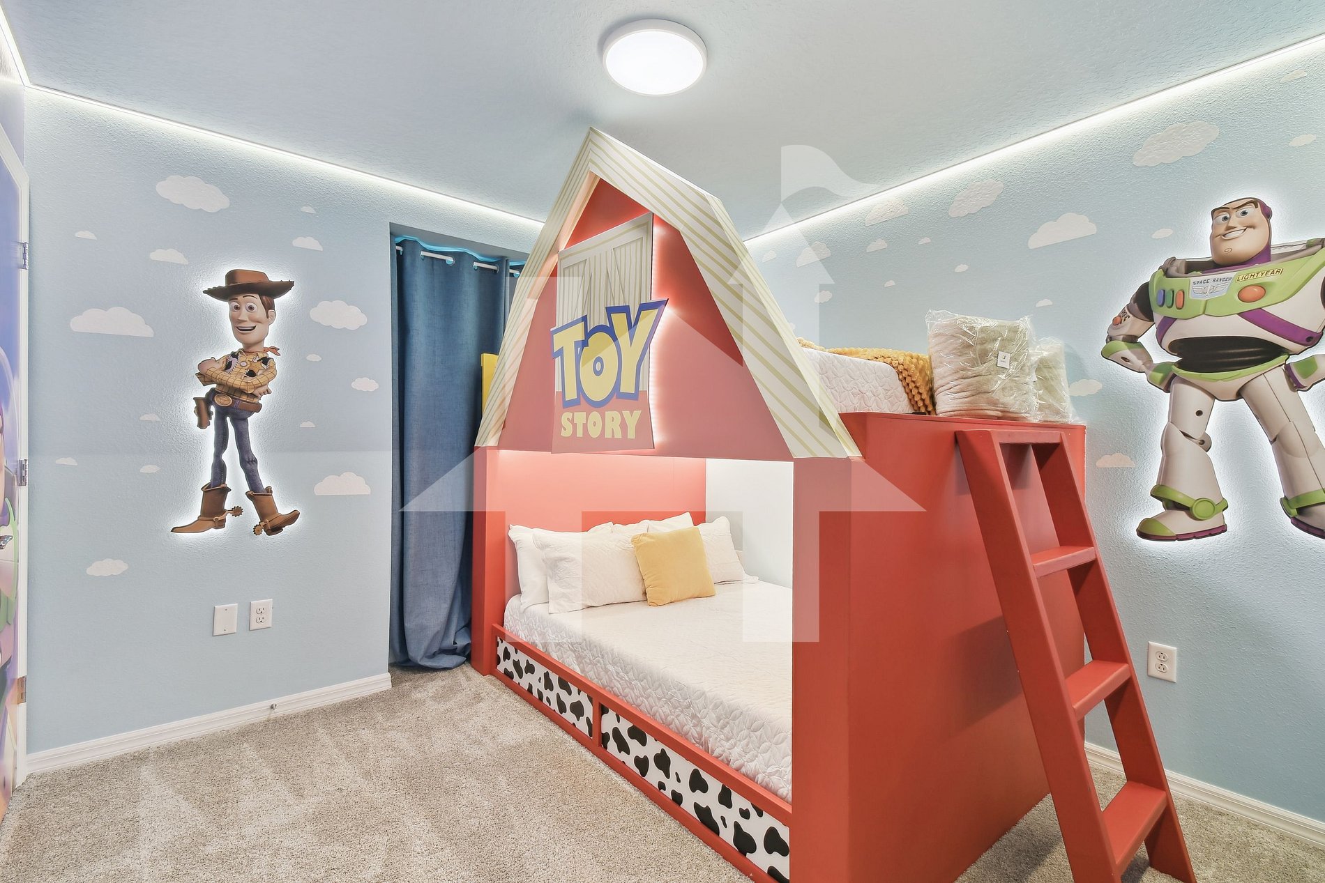 -Quarto temático Toy Story com beliche (full over full) e smart TV.
