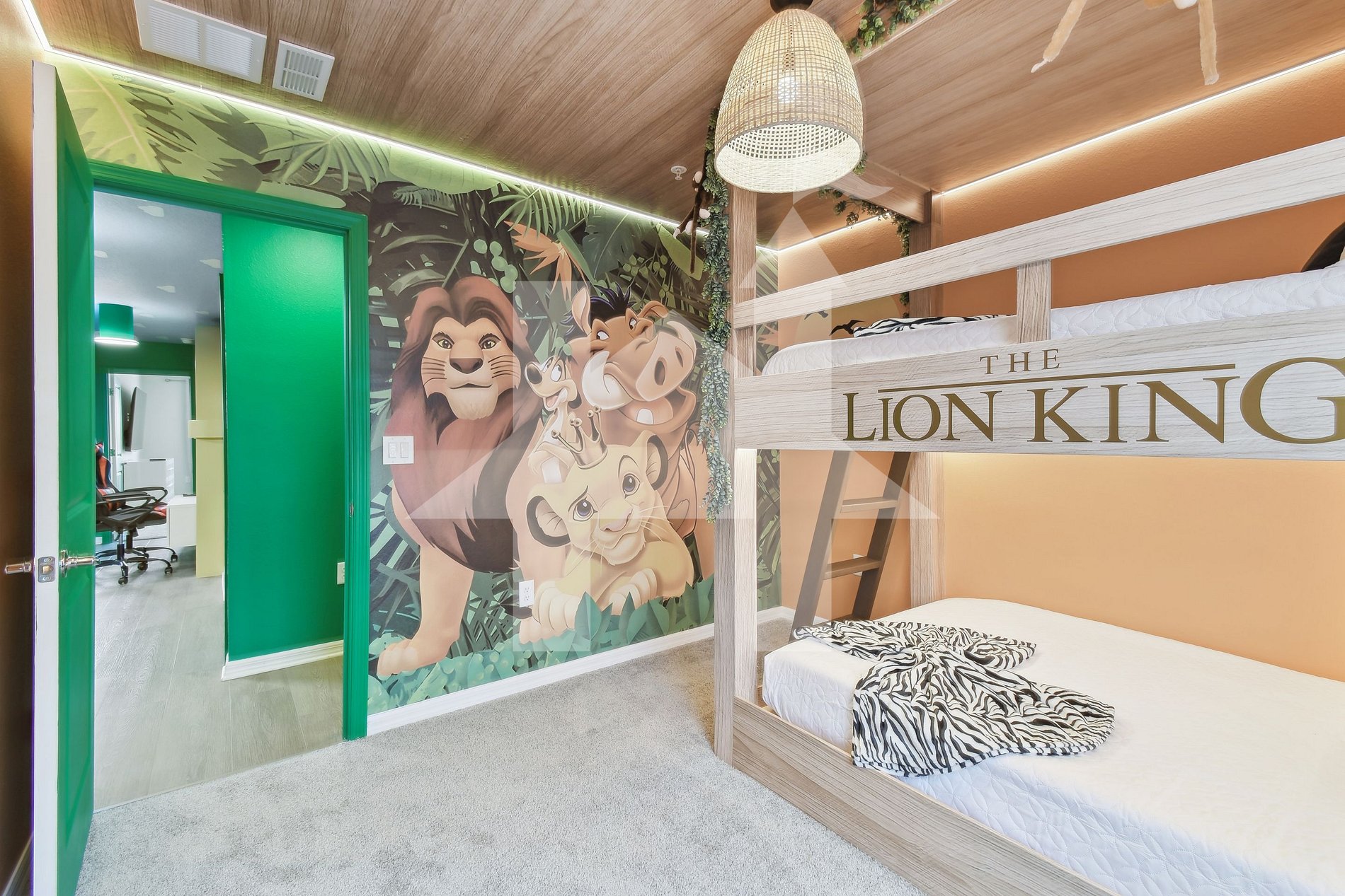 -Quarto temático O Rei Leão com beliche (full over full) e smart TV.