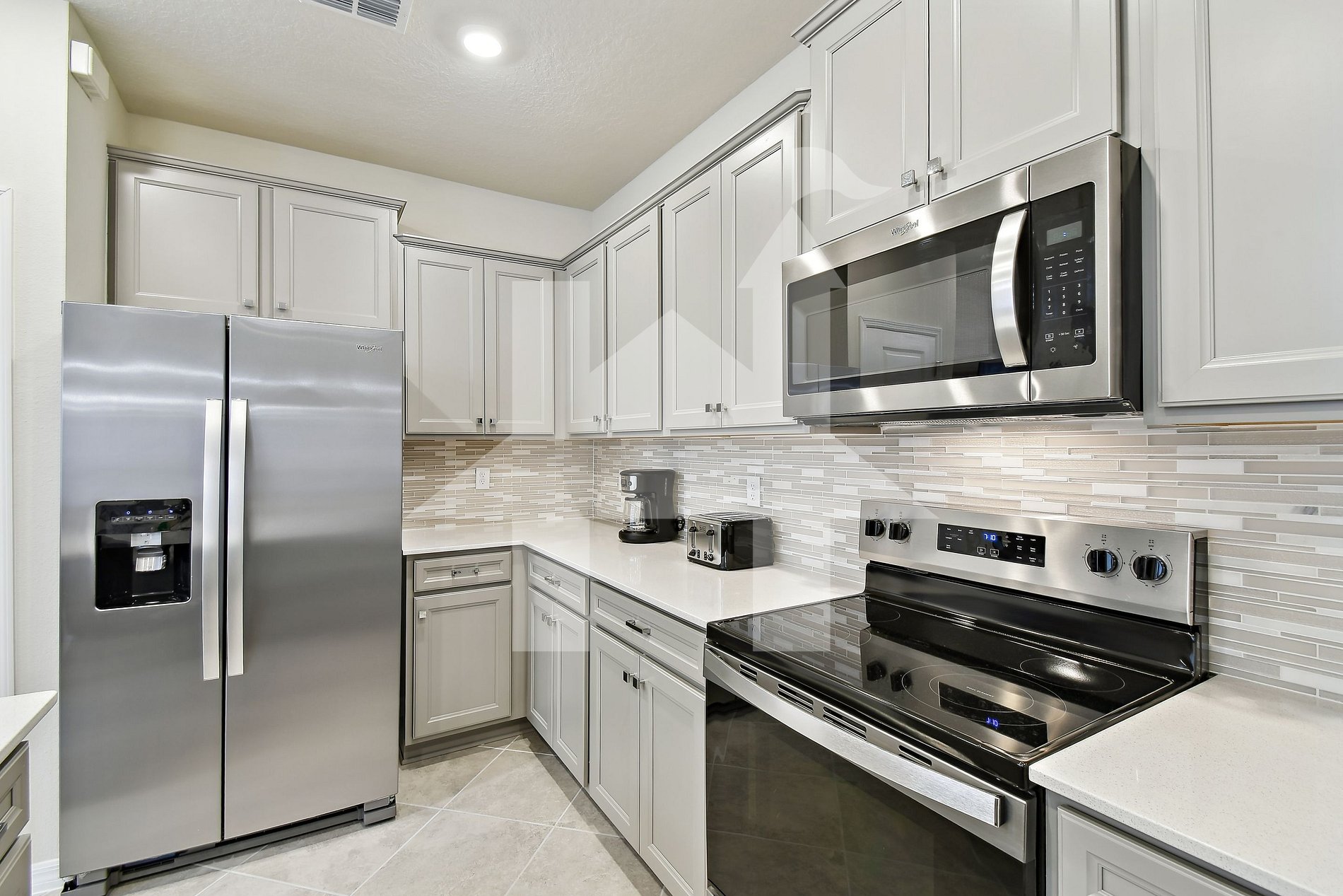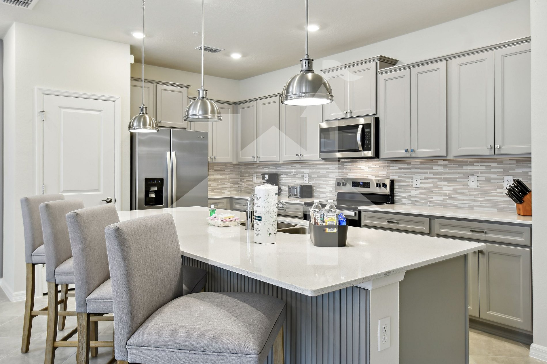 -Cozinha completa com eletrodomésticos modernos e bancada para refeições rápidas.