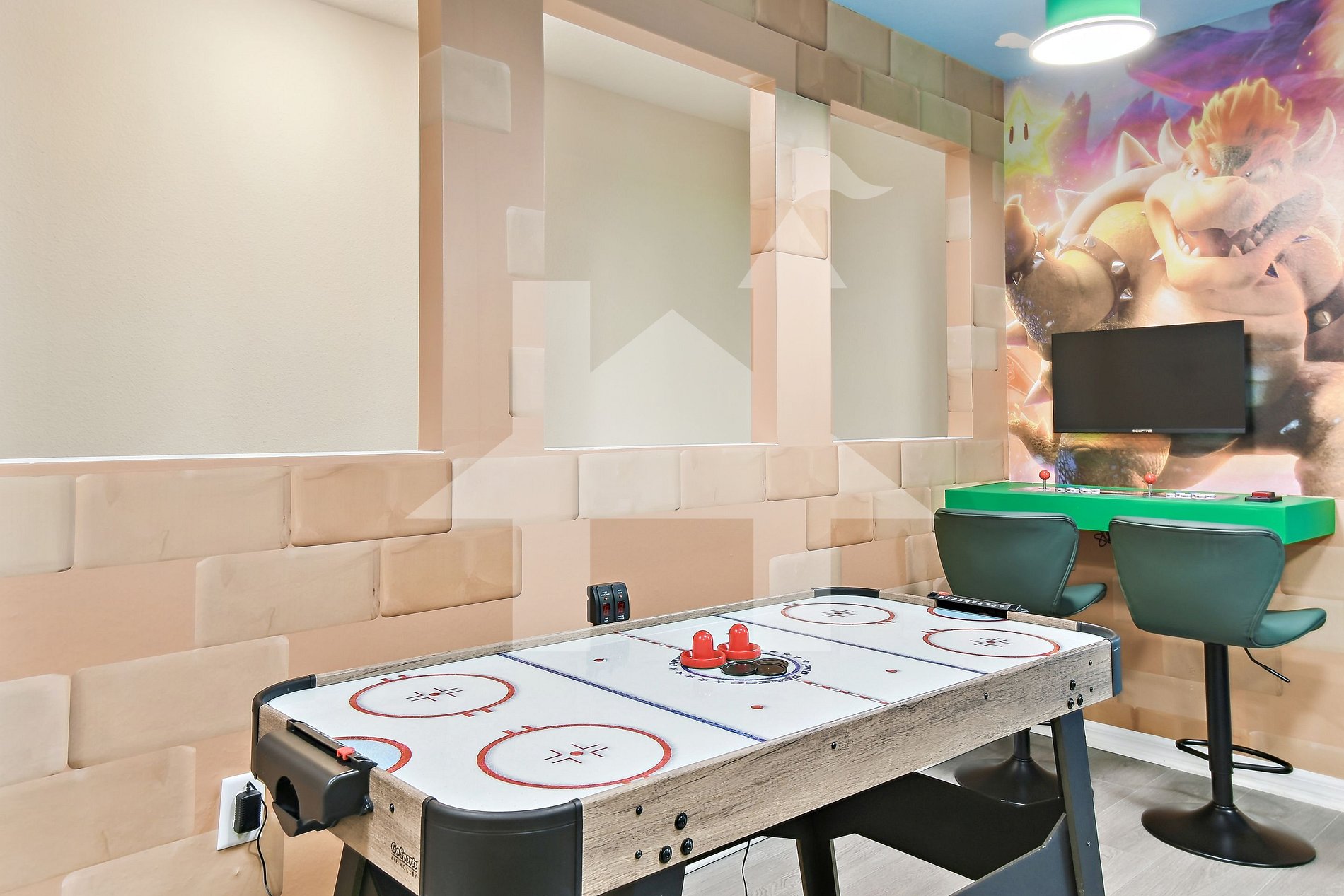 -Sala de jogos temática Mario Bros e Donkey Kong com pebolim e consoles de videogame.