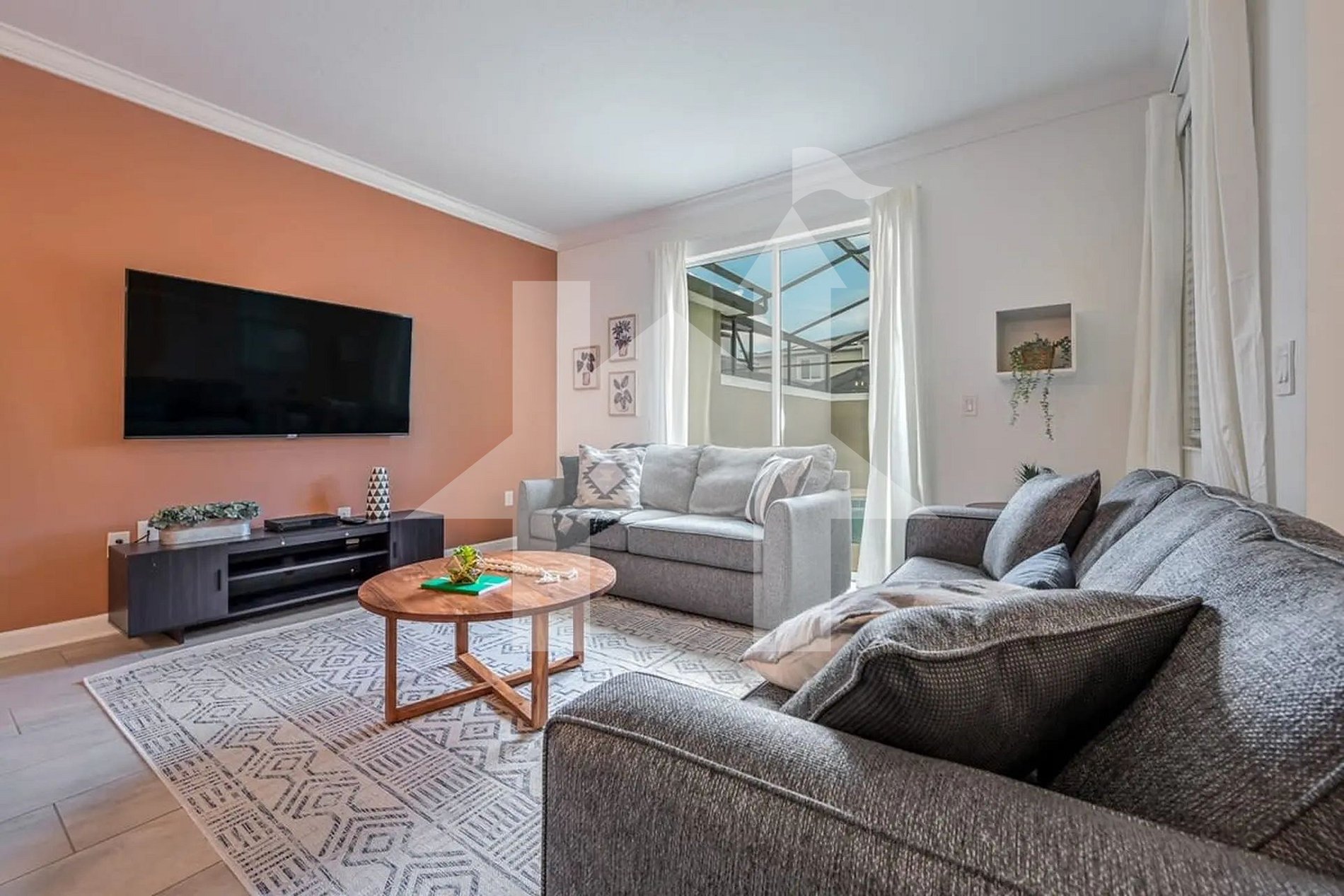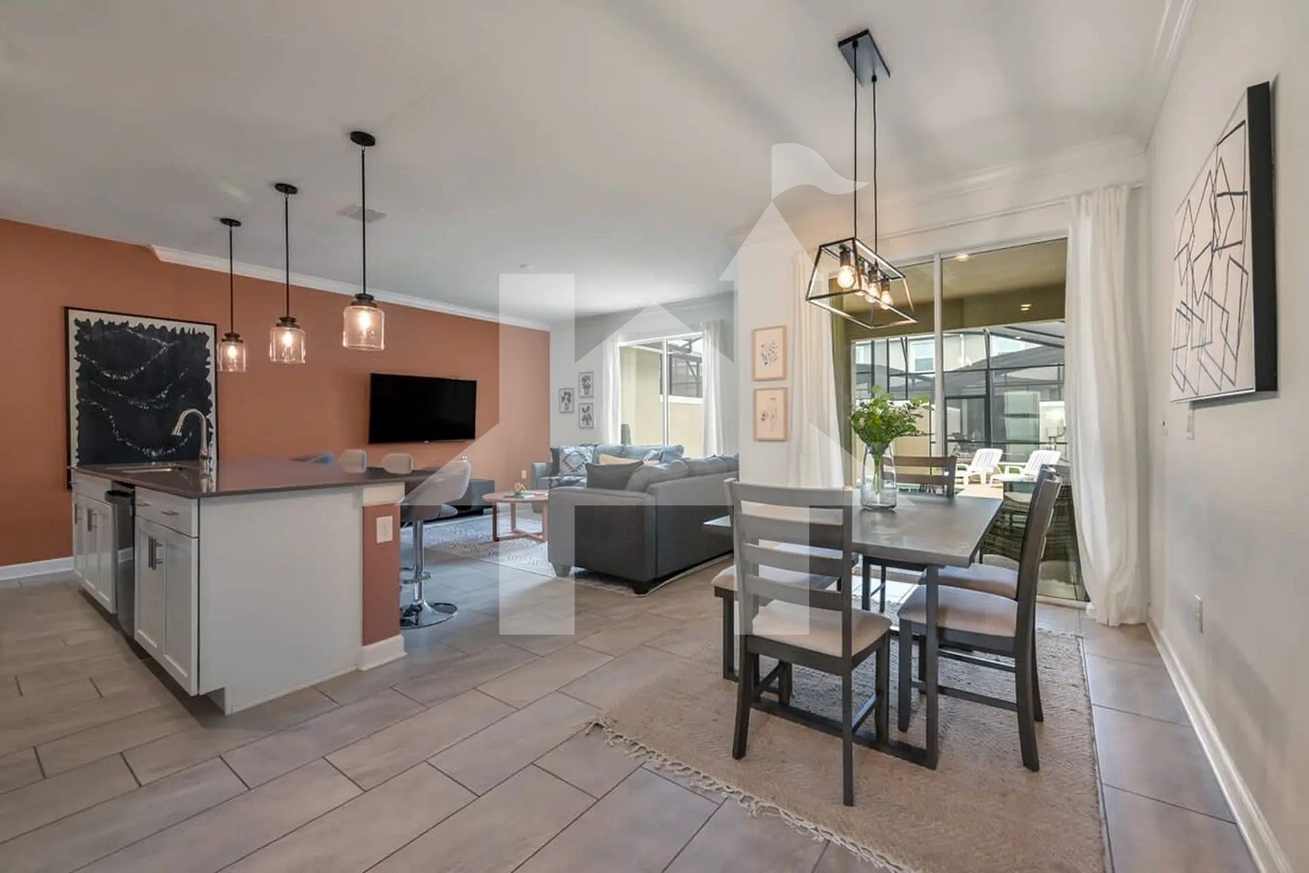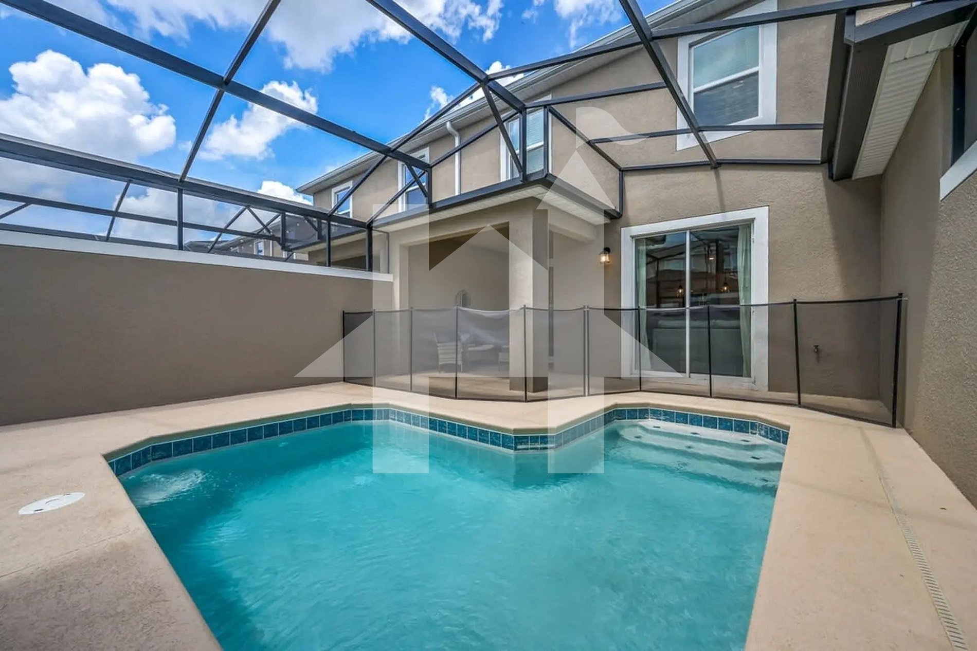 Na área externa, o grande destaque é o pátio privativo com piscina aquecível. Imagine relaxar aqui após um longo dia nos parques — sob o céu da Flórida, ouvindo uma música tranquila, fazendo um churrasco (disponível mediante solicitação) ou simplesmente aproveitando o sol. Um espaço perfeito para momentos de paz e lazer com total privacidade.