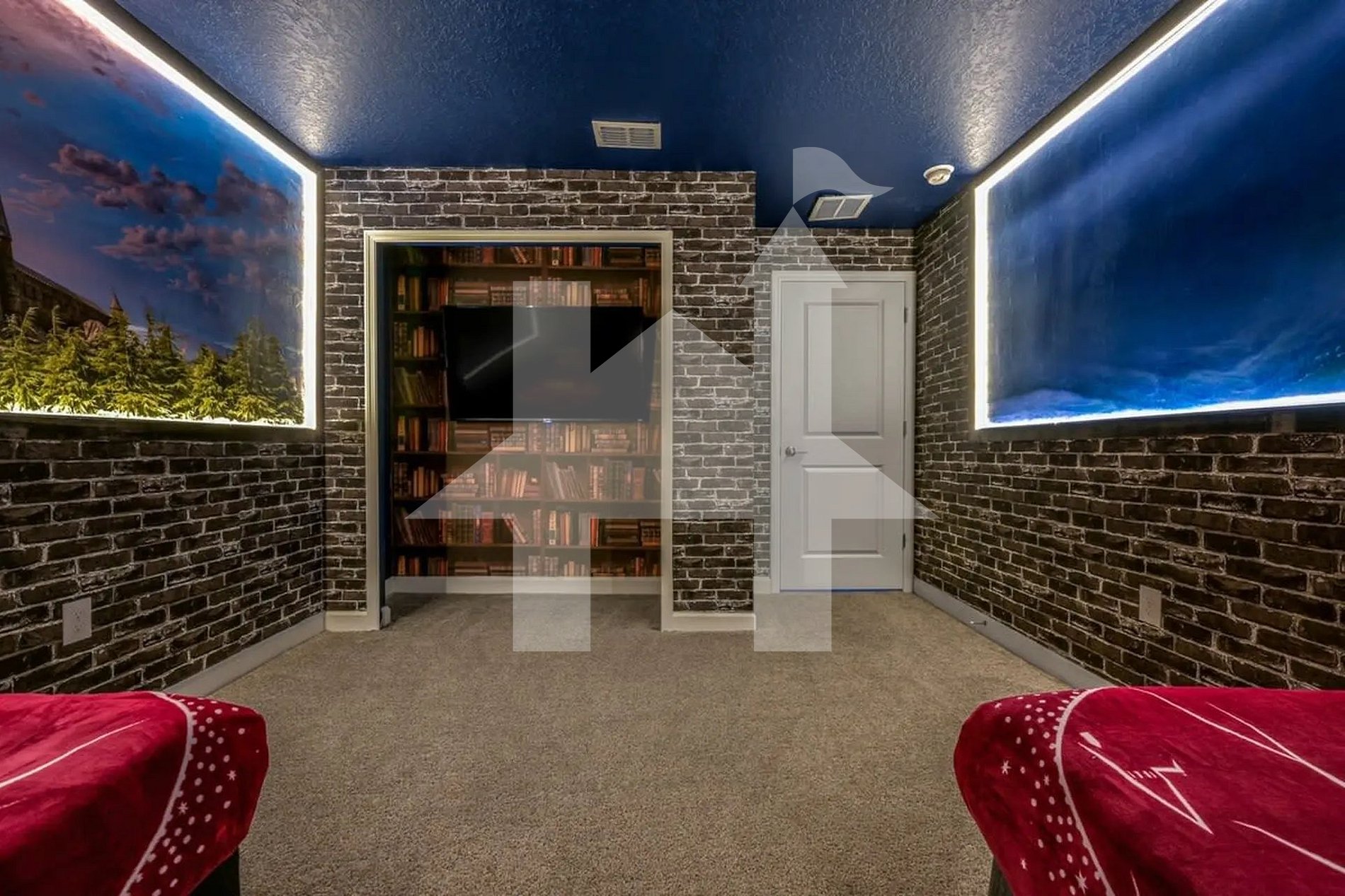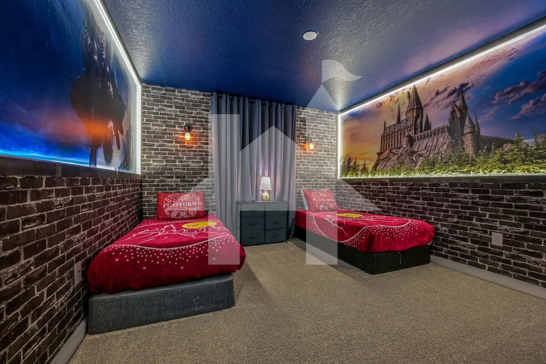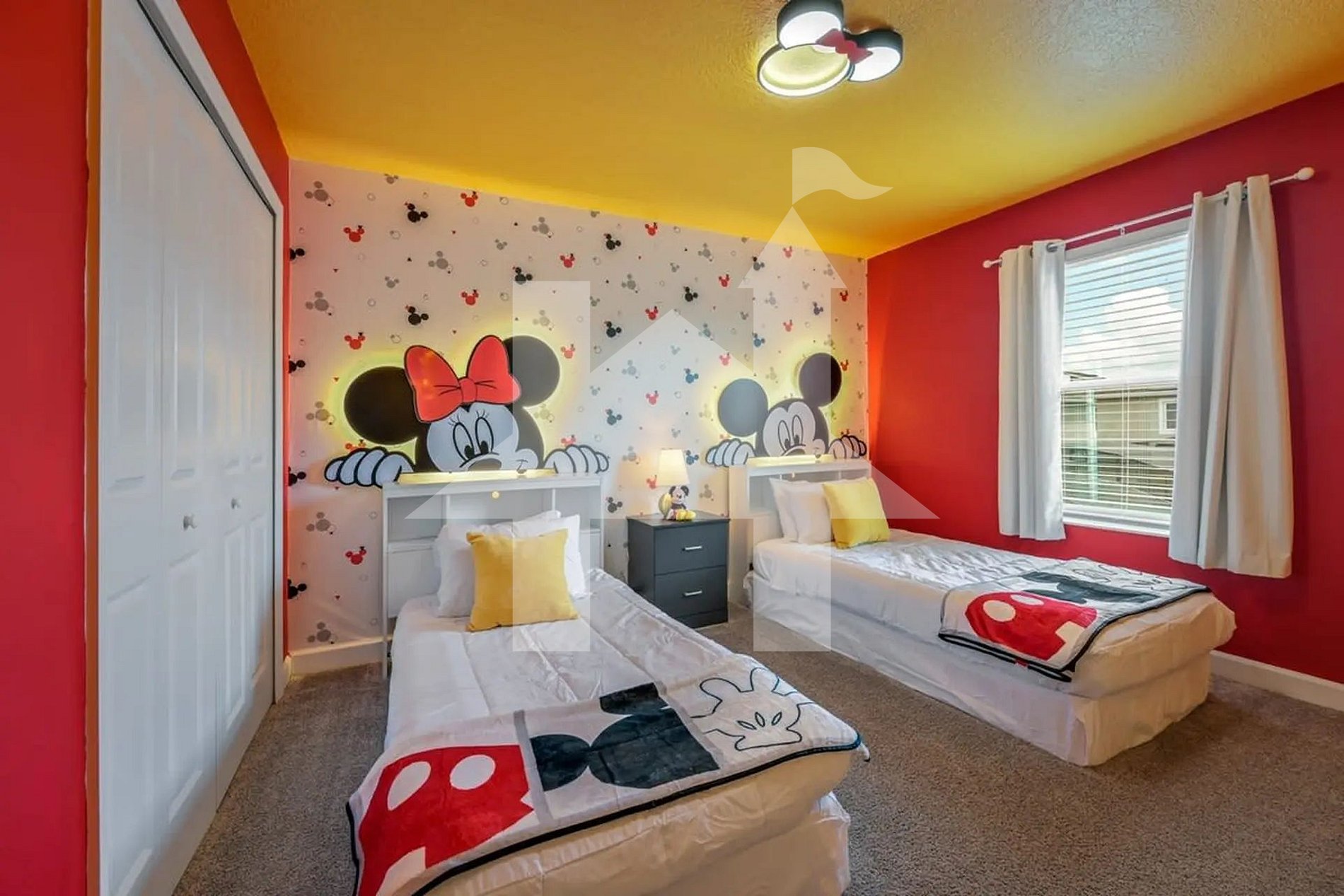 No térreo, há um quarto com cama queen e um banheiro adjacente — ideal para hóspedes que preferem evitar escadas. No andar superior, encontra-se a suíte master com cama king e banheiro privativo, além de outro quarto com cama queen e dois quartos temáticos para crianças — um com tema do Mickey e outro inspirado em Harry Potter — ambos com duas camas de solteiro. Os quartos infantis compartilham um banheiro, sendo perfeitos para irmãos ou amigos que desejam dividir o espaço com conforto e privacidade.