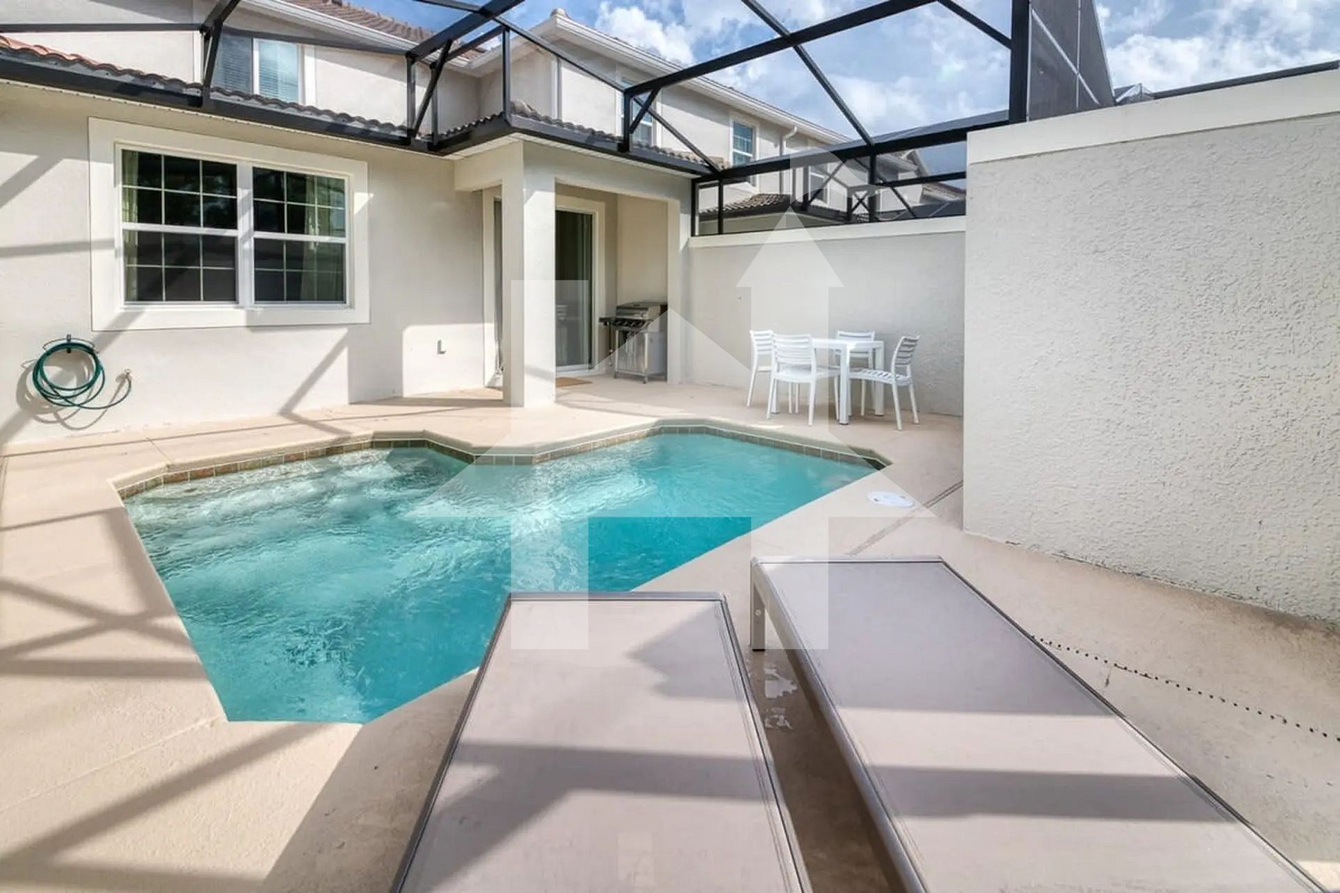 Na área externa, o pátio privativo conta com uma piscina aquecível cercada por tela de proteção, perfeita para relaxar após um dia nos parques. A área ao ar livre também possui espaço para sentar e aproveitar o clima da Flórida com conforto e privacidade.