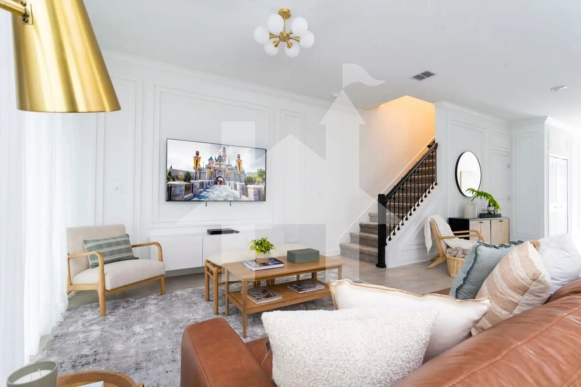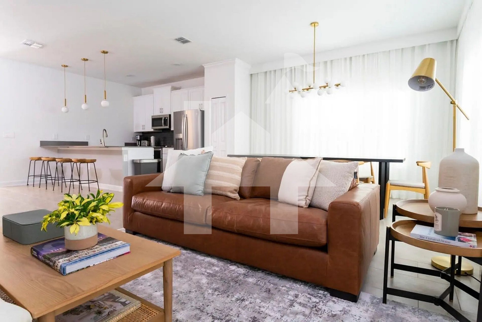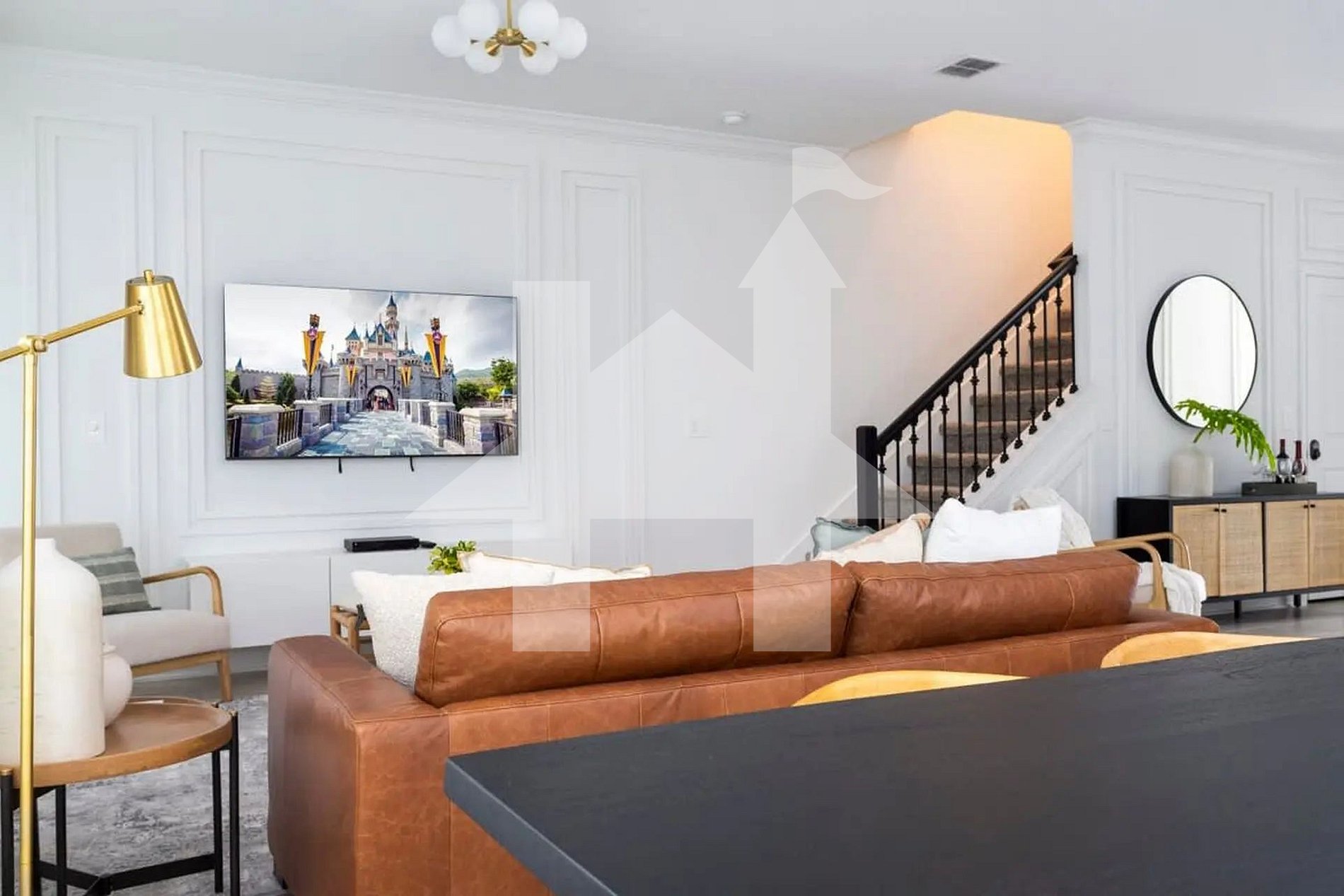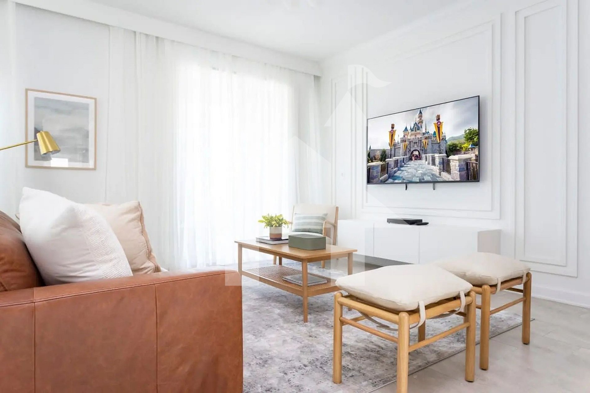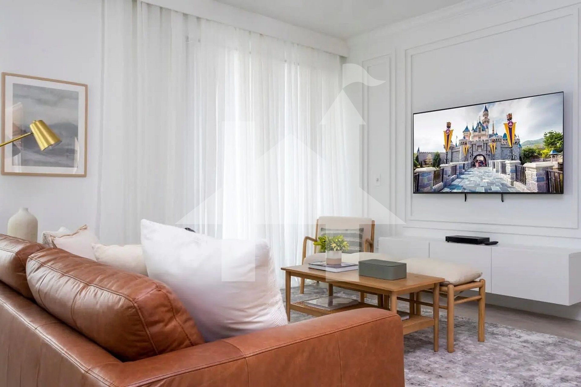 Ambiente amplo, iluminado e integrado à sala de jantar e à cozinha completa — perfeito para momentos em família. A decoração moderna, o sofá confortável e a TV de tela grande criam o cenário ideal para relaxar após um dia nos parques.