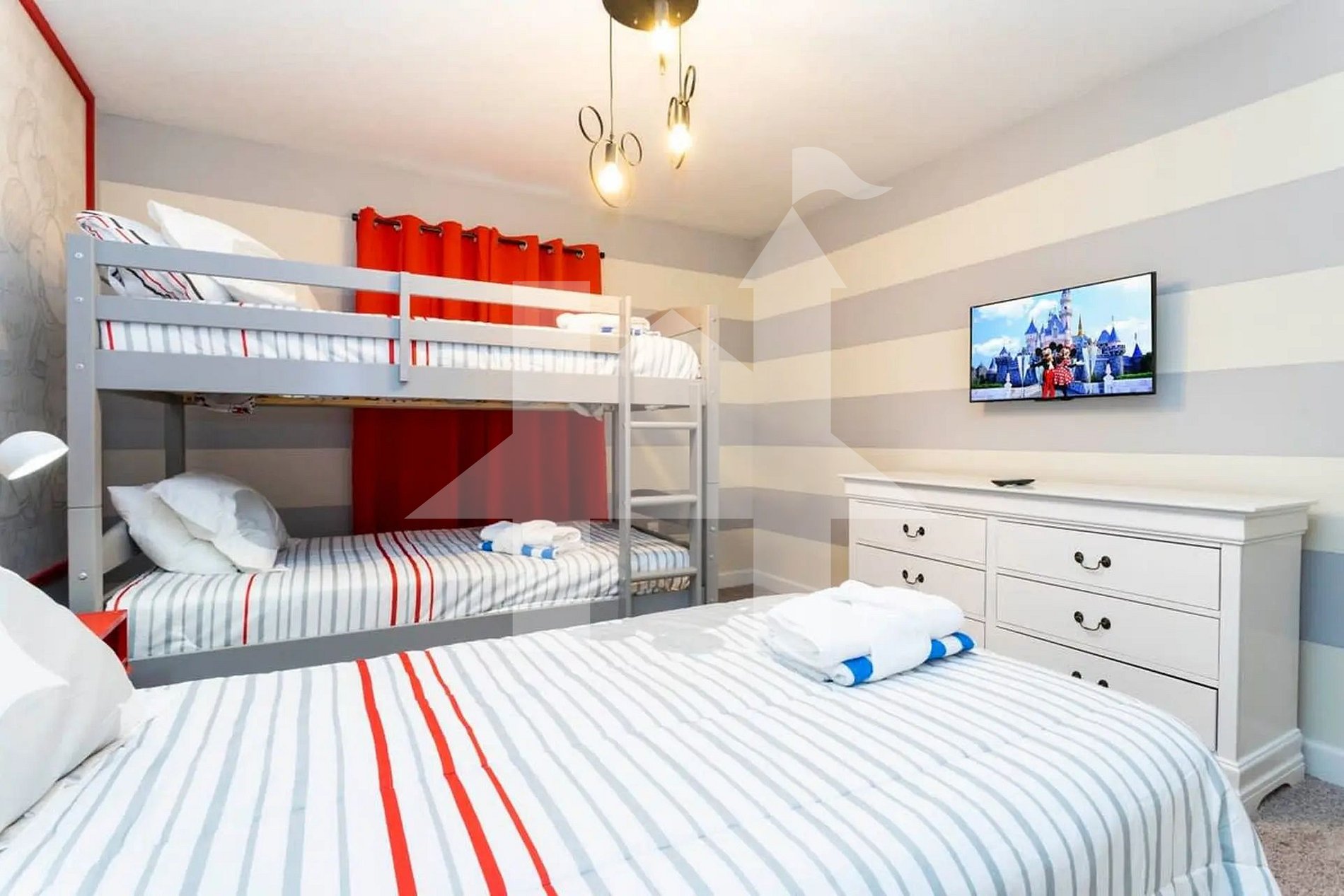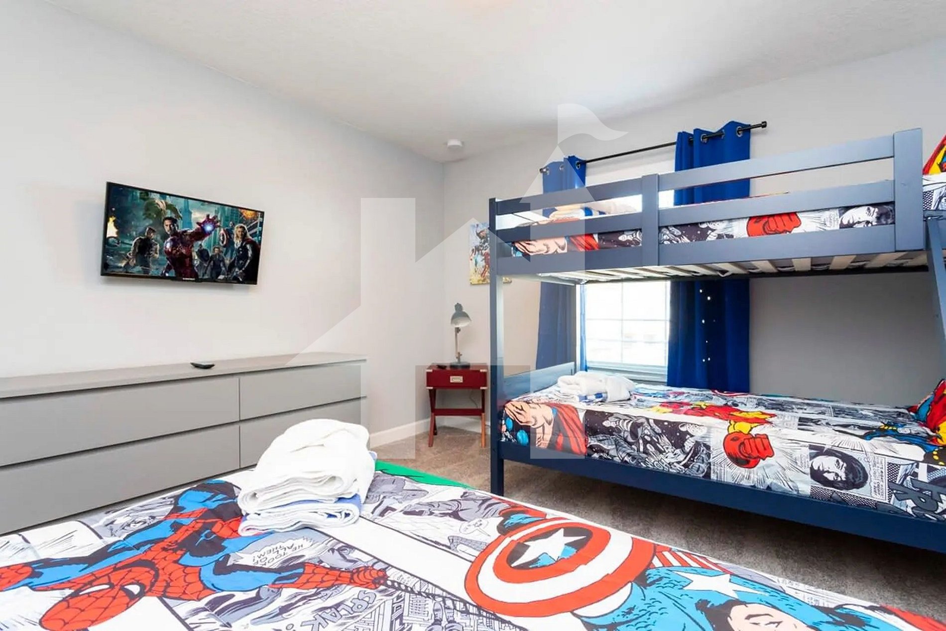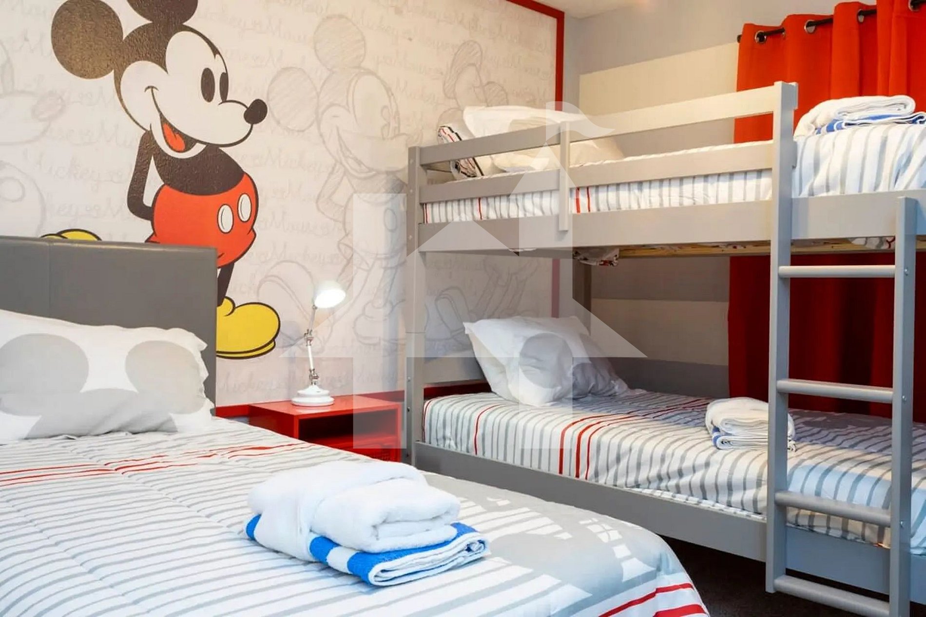 No andar superior, a suíte principal conta com cama queen, enxoval de qualidade e banheiro privativo com pias duplas e um amplo box com chuveiro. Os outros dois quartos são temáticos e encantadores: um inspirado no universo do Mickey Mouse e outro no tema Vingadores, ambos com três camas de solteiro cada, proporcionando acomodações divertidas e confortáveis para crianças e adultos. Um terceiro banheiro completo é compartilhado entre esses dois quartos.