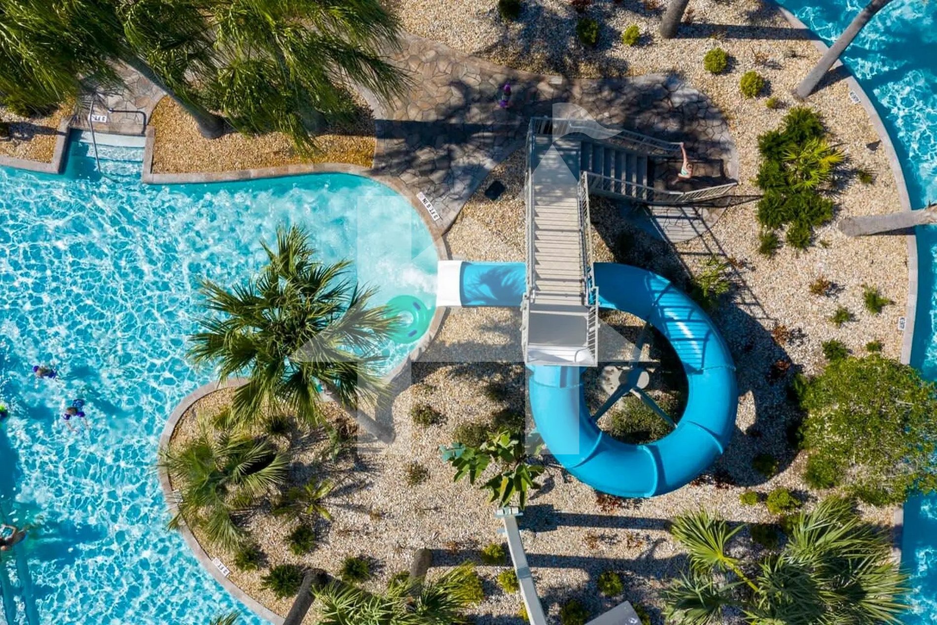 Rio lento, toboáguas e área infantil com splash zone