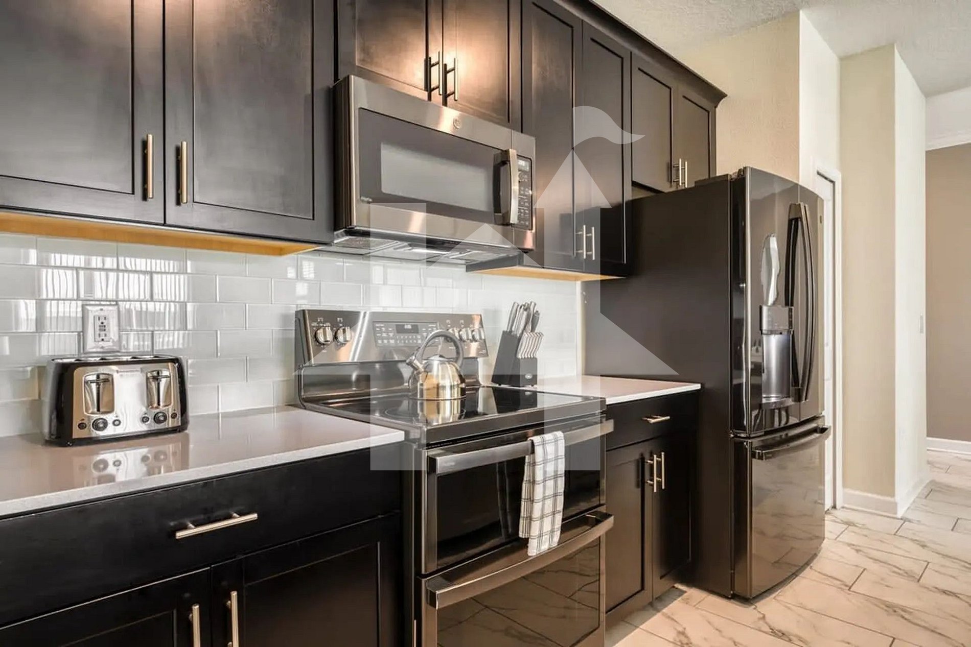 Cozinha completa com eletrodomésticos modernos em inox, utensílios, cafeteira, liquidificador e muito mais