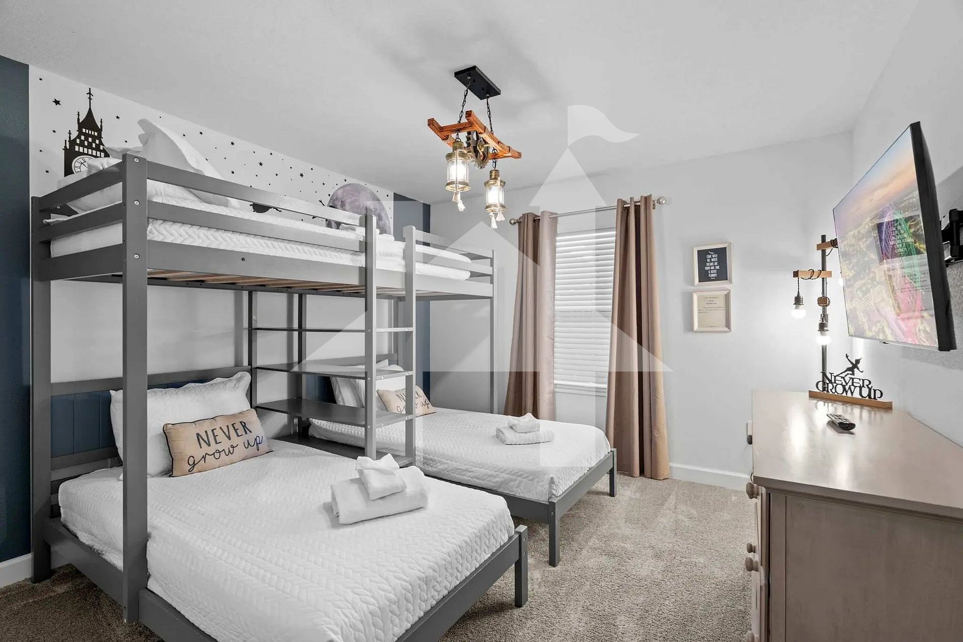 Quarto Peter Pan: Beliche com três camas de solteiro, em um ambiente lúdico e acolhedor.