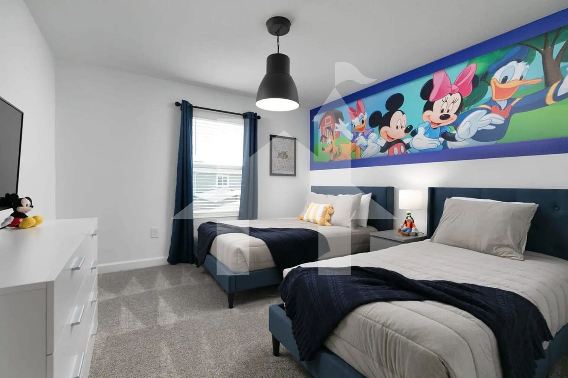 No térreo, há um quarto com cama king e um banheiro completo ao lado. No andar superior, a suíte master possui cama king e banheiro privativo, além de dois quartos temáticos. Um é decorado com tema do Mickey e seus amigos, e o outro com tema Toy Story. Cada quarto temático oferece uma cama de casal e uma de solteiro, compartilhando um banheiro completo.