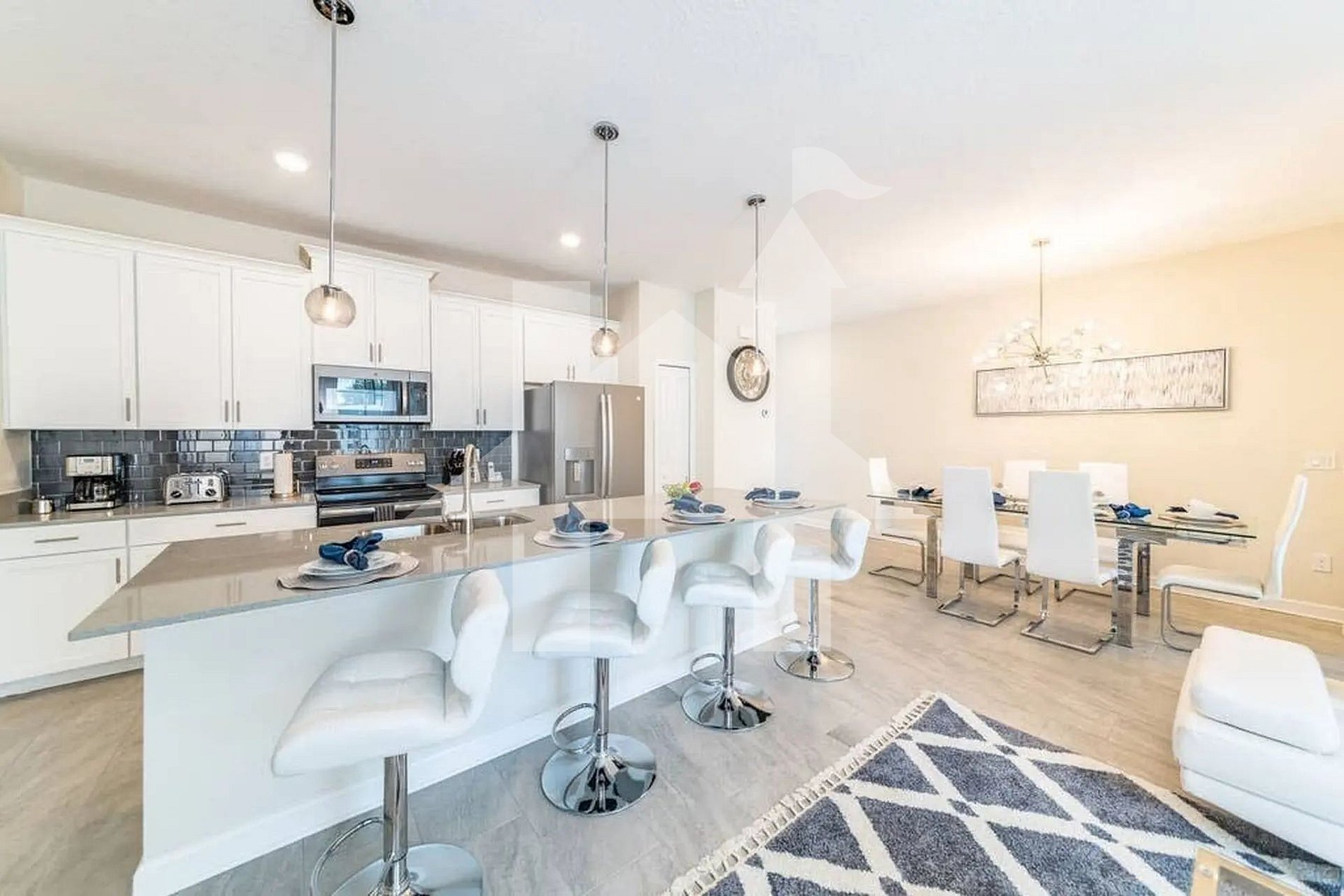 Entre em um ambiente moderno com layout em conceito aberto, onde a cozinha totalmente equipada, a sala de jantar acolhedora e a ampla sala de estar se conectam de forma fluida, criando o cenário ideal para momentos em família ou com amigos. As portas de vidro se abrem para o pátio privativo, onde você poderá relaxar em sua piscina aquecível particular, perfeita para recarregar as energias após um dia nos parques.