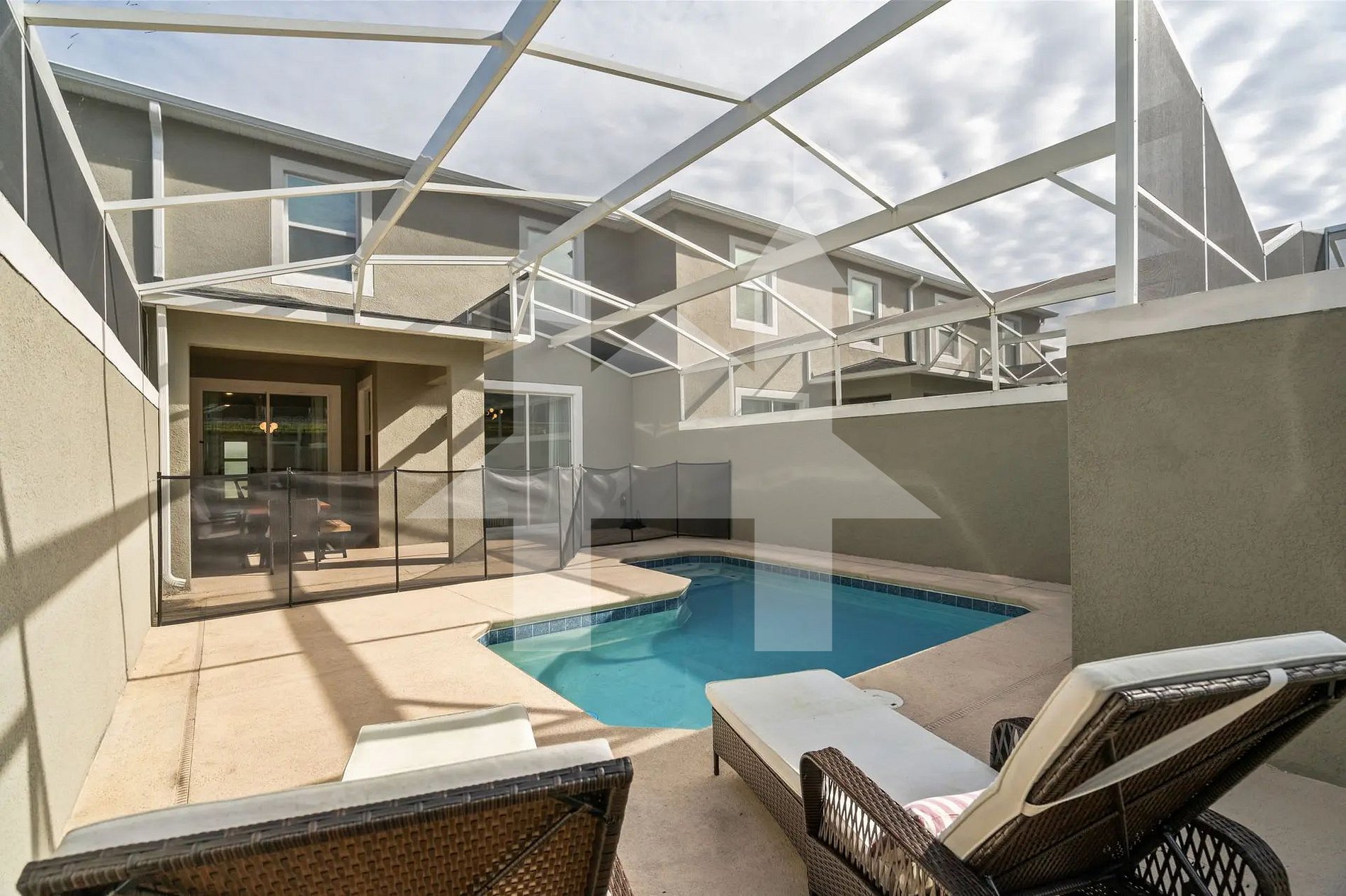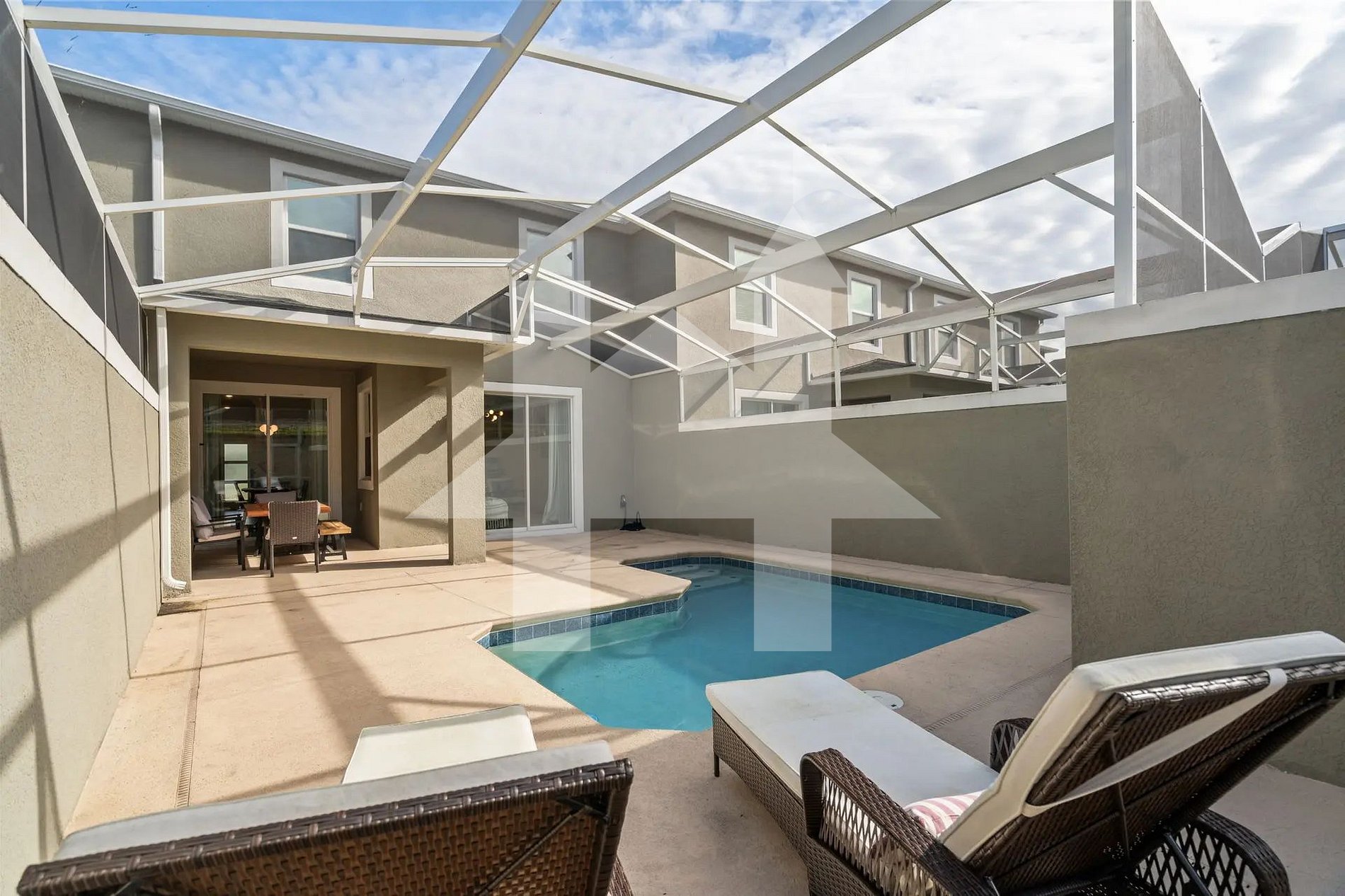 No pátio privativo com tela de proteção, aproveite a piscina aquecível, perfeita para os dias ensolarados da Flórida ou noites relaxantes após os parques. Para completar, há também uma churrasqueira (BBQ) disponível para refeições ao ar livre.