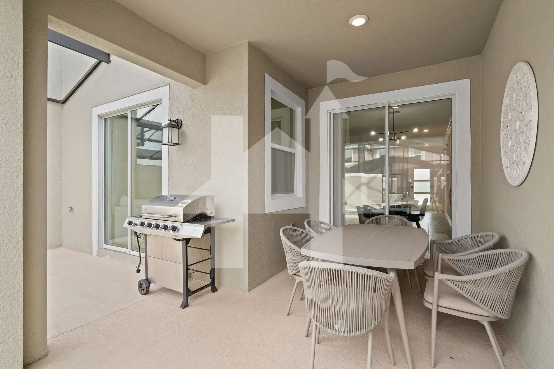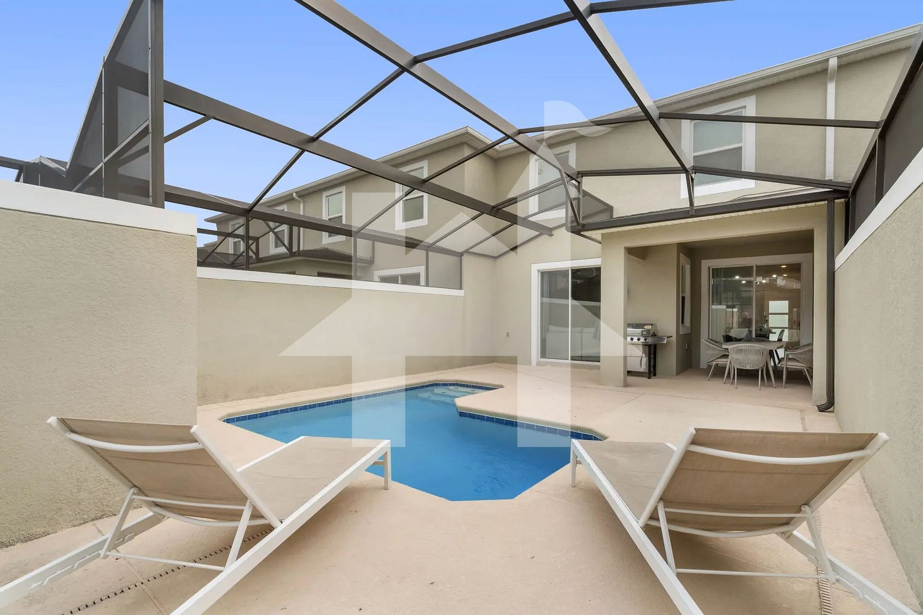 Na área externa, o pátio privativo com piscina é ideal para aproveitar os dias ensolarados da Flórida ou relaxar à noite. Há também uma churrasqueira (BBQ) disponível para refeições ao ar livre.
