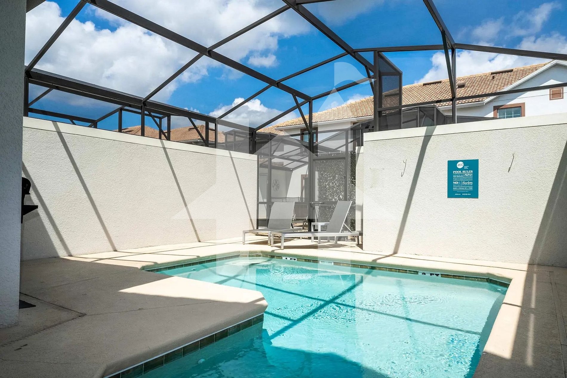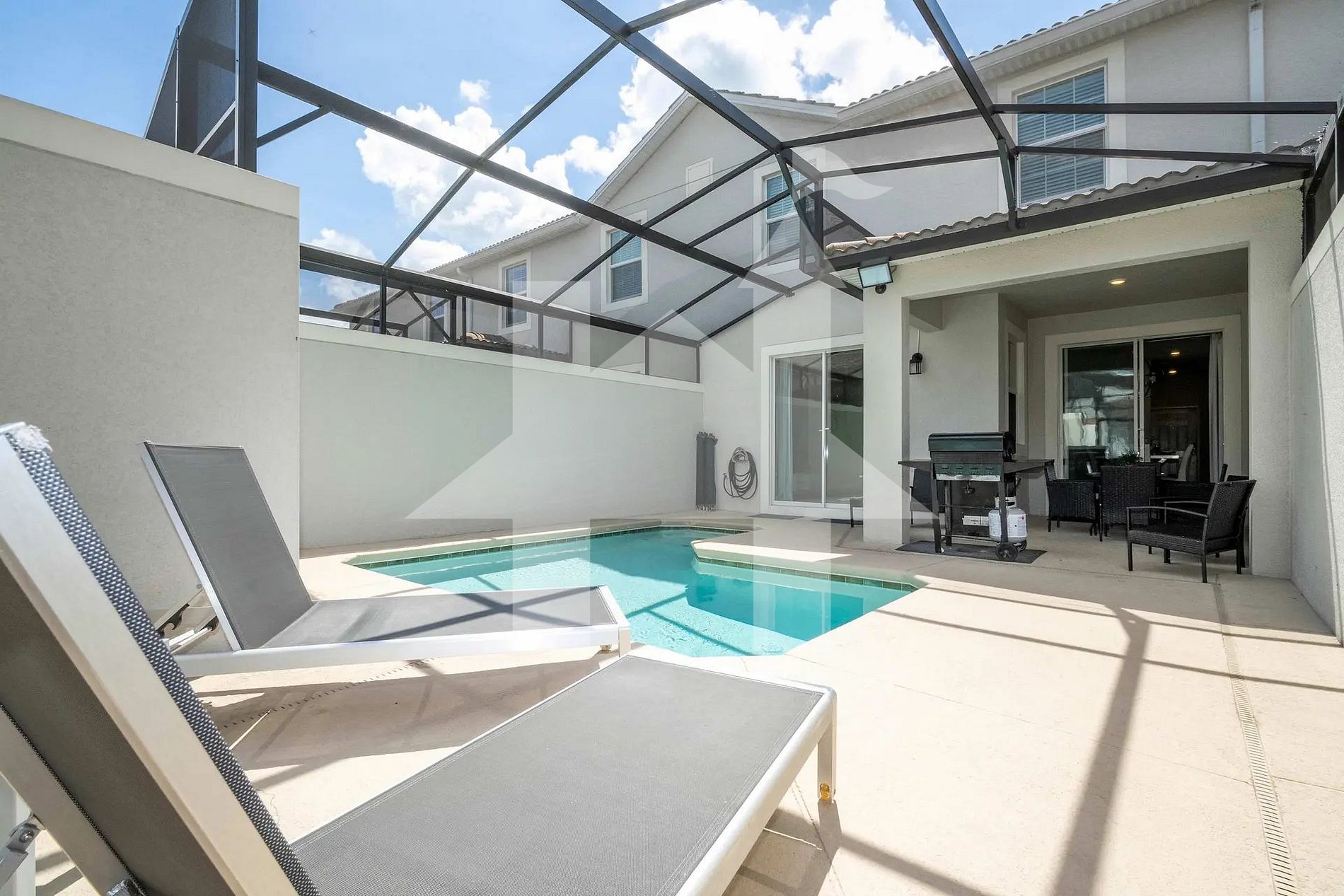 No pátio privativo com tela de proteção, aproveite a piscina aquecível, ideal para mergulhos refrescantes durante o dia ou momentos de descanso após os parques. Uma churrasqueira (BBQ) também está disponível para refeições ao ar livre.
