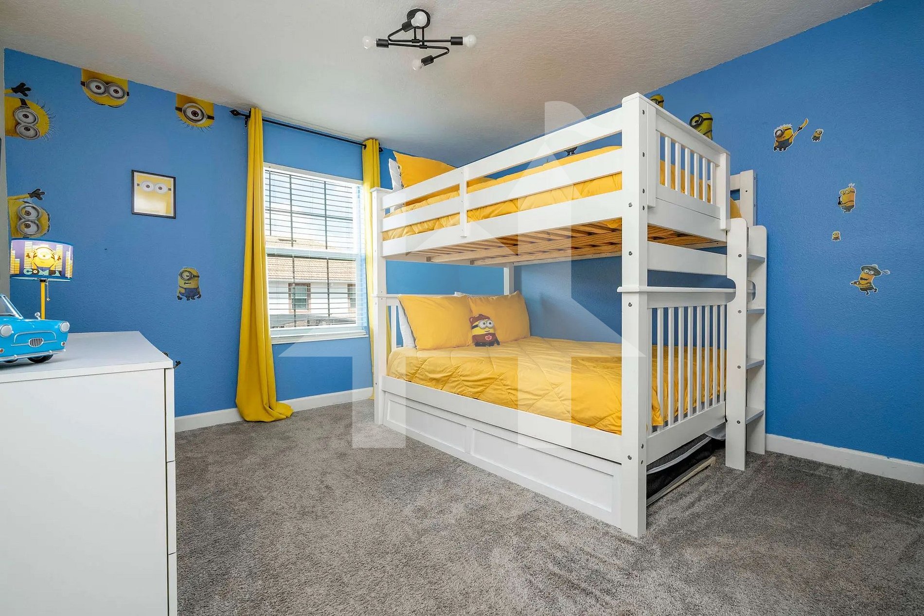 Quarto Minions (temático): 2 camas de casal + 1 cama de solteiro auxiliar — colorido e divertido