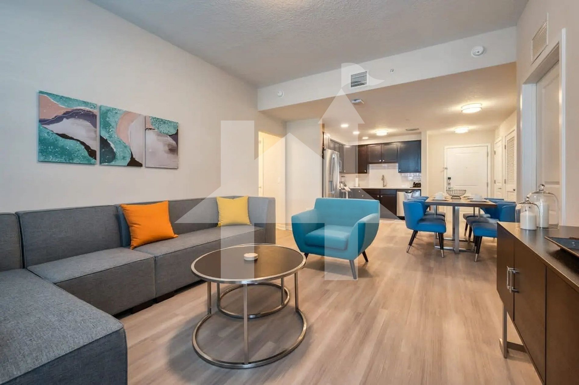 Entre em um apartamento moderno, iluminado e totalmente mobiliado, pensado para oferecer conforto e praticidade. A área de convivência em conceito aberto conta com uma sala aconchegante com sofá espaçoso e TV de tela plana, sala de jantar elegante para refeições em grupo e uma cozinha completa, equipada com eletrodomésticos em inox, bancadas em granito e todos os utensílios necessários para preparar suas próprias refeições. É o ambiente ideal para relaxar após um dia nos parques ou curtir um jantar em família.