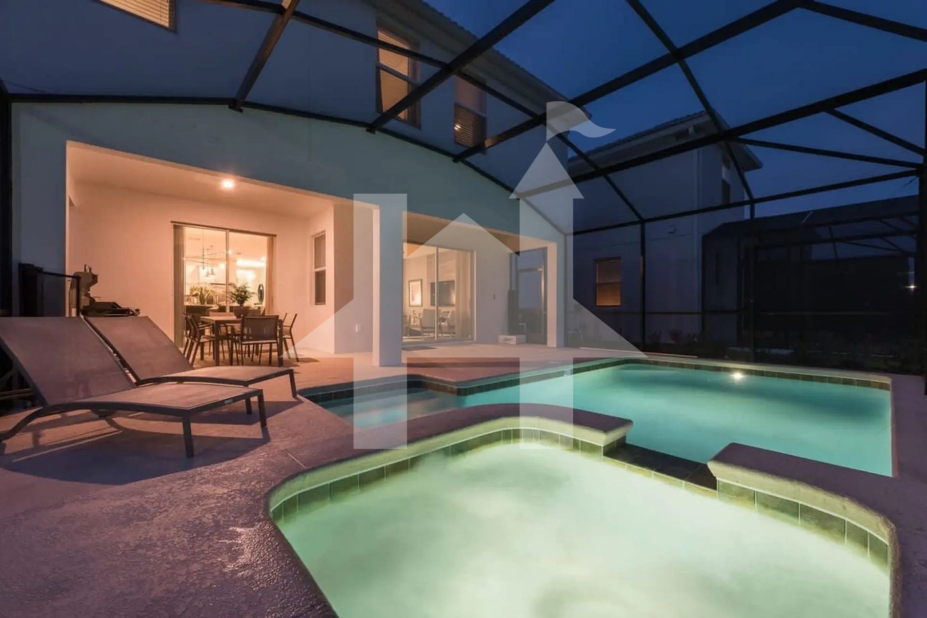 Do lado de fora, aproveite sua piscina privativa aquecível, equipada com espreguiçadeiras e área coberta com mesa de jantar externa—perfeita para refeições ao ar livre ou um drink no fim da tarde. O espaço externo é ideal para curtir com a família ou relaxar depois de um dia nos parques.