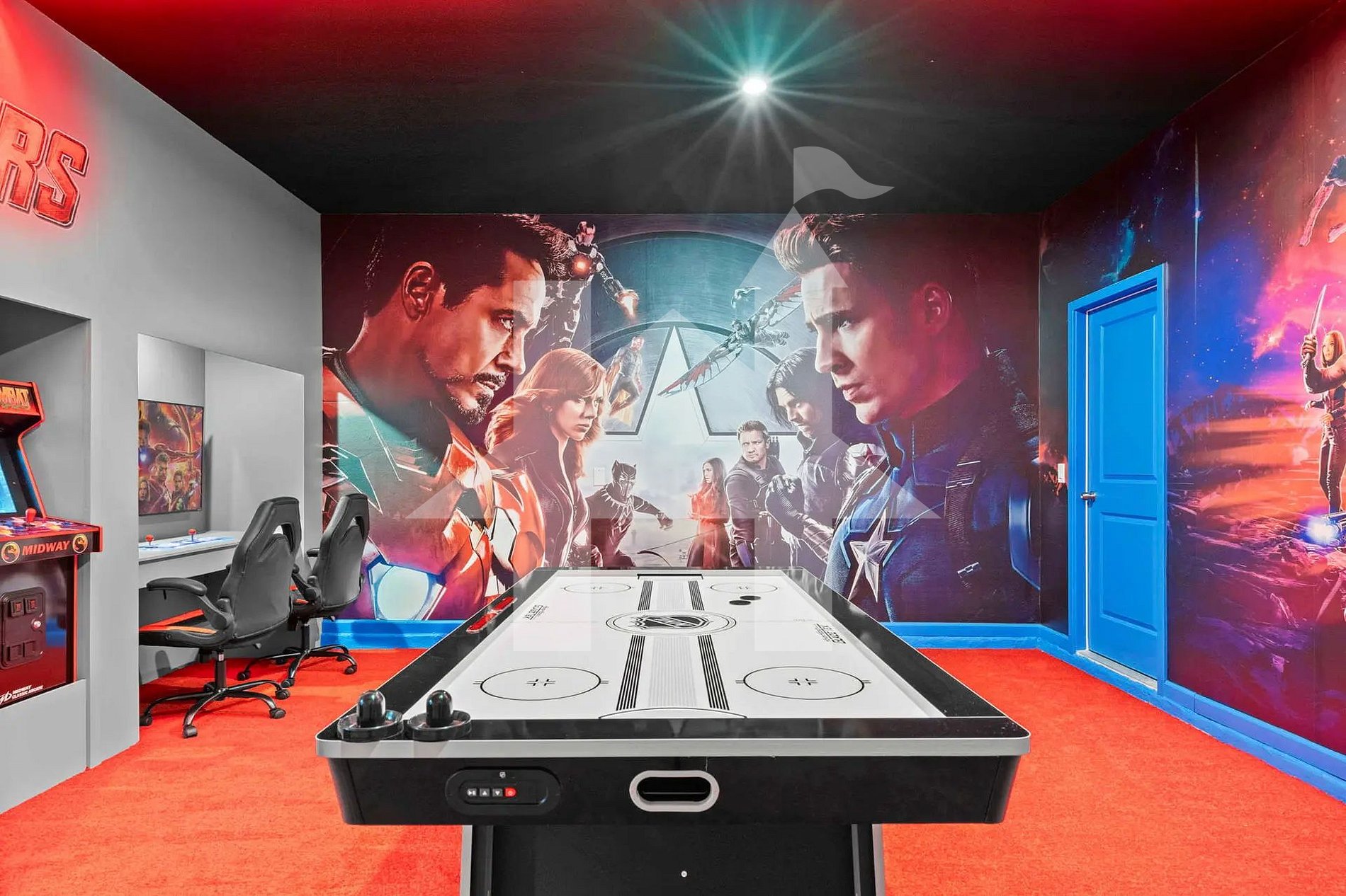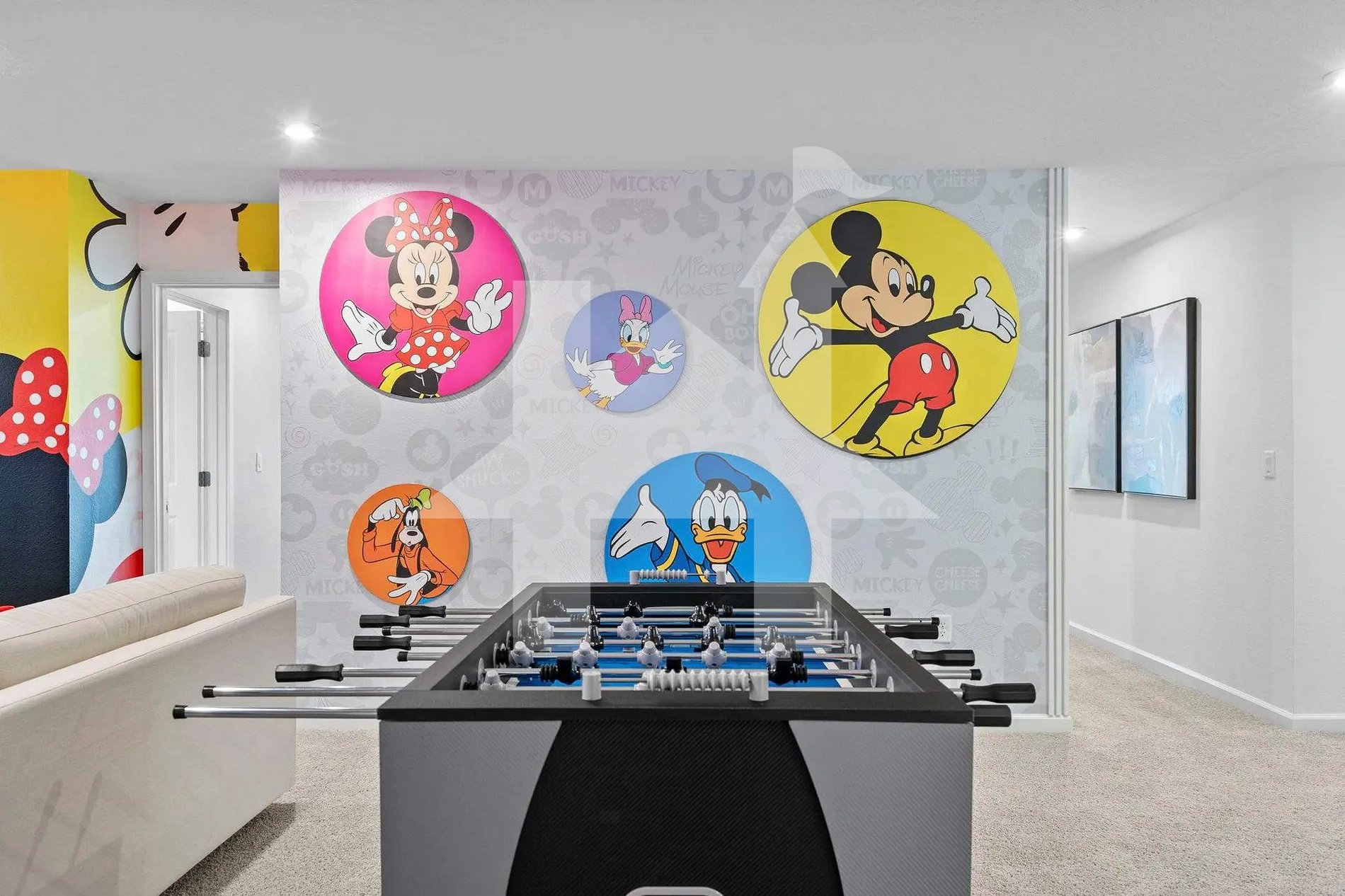 No andar superior, você encontrará uma vibrante sala de jogos com tema do Mickey e pebolim para diversão sem fim. Este andar inclui: