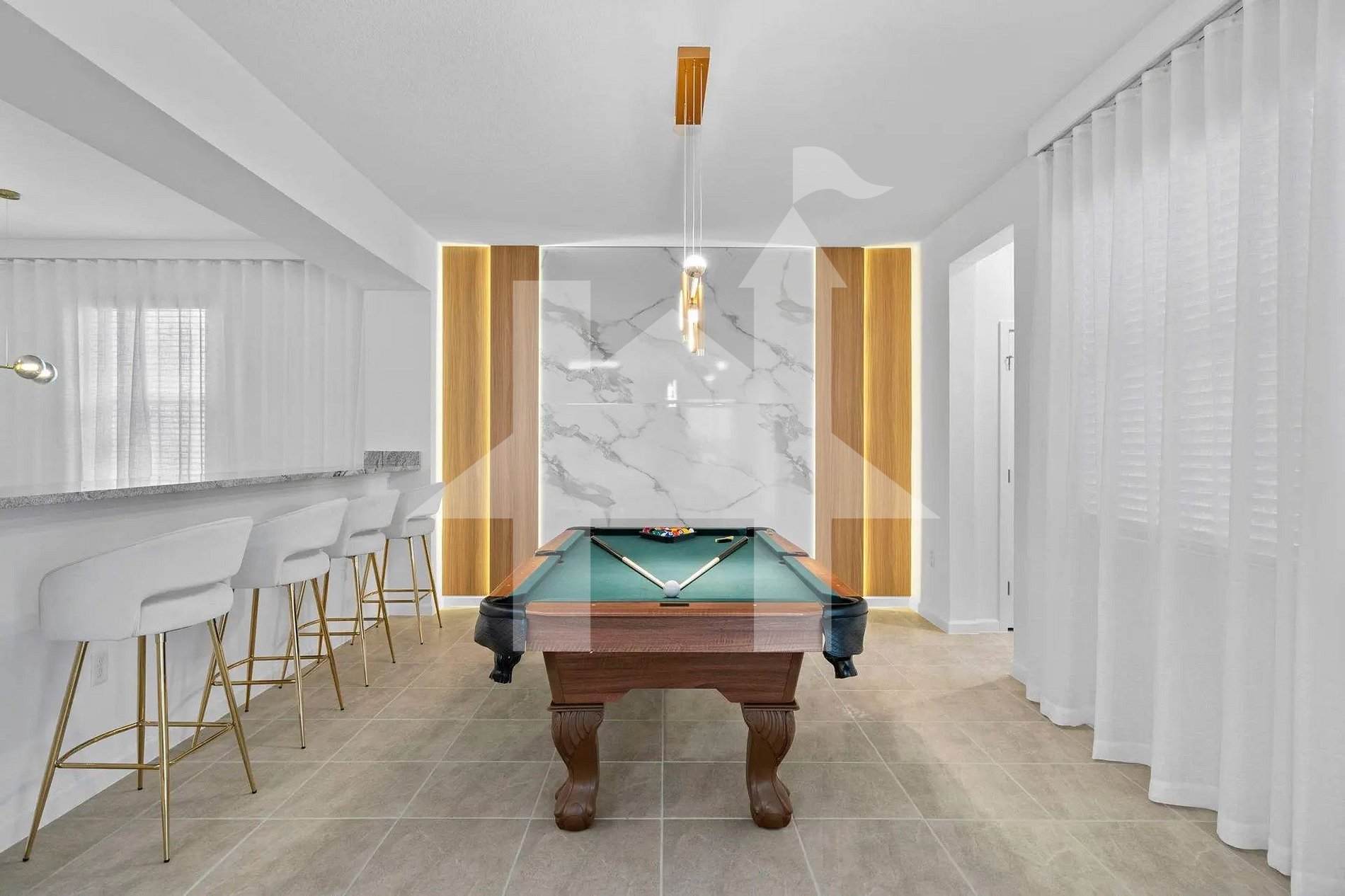 O andar térreo recebe você com uma ampla sala de estar em conceito aberto, elegantemente decorada, integrada à sala de jantar e à cozinha totalmente equipada — ideal para refeições em grupo e celebrações. Os adultos podem relaxar no lounge sofisticado com mesa de bilhar, enquanto o pátio externo convida a momentos de descanso na piscina privativa aquecível e no spa. Um lavabo e uma suíte master com cama king completam este nível.