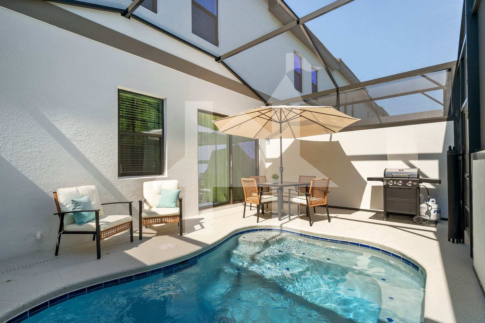 A área externa possui uma piscina privativa aquecível, com espreguiçadeiras para relaxar após um dia nos parques. O uso da piscina aquecida e da churrasqueira está disponível mediante taxa adicional.