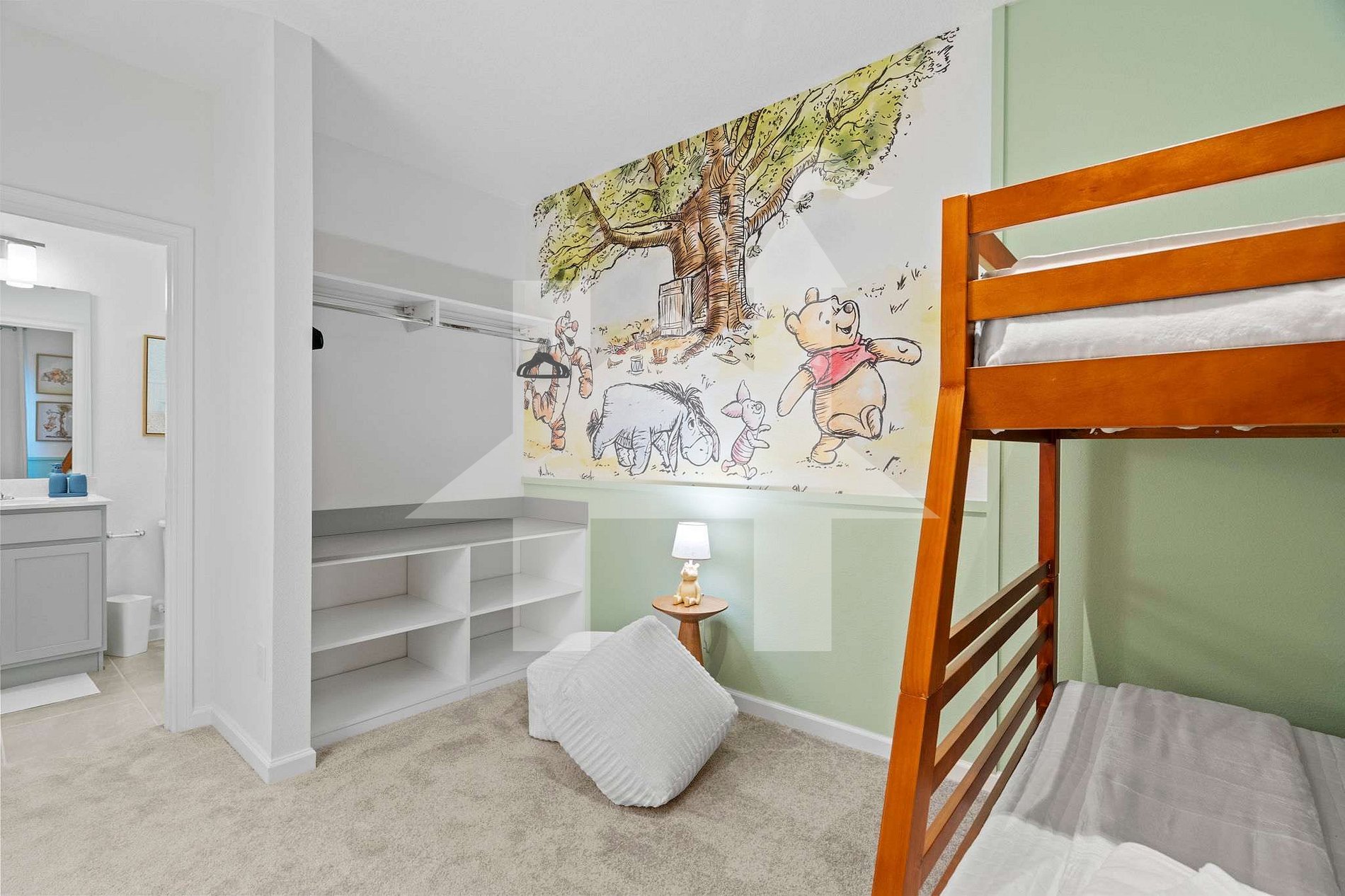 Quarto 4 (Temático - Ursinho Pooh): 1 cama de casal + 1 cama de solteiro (beliche) + banheiro privativo