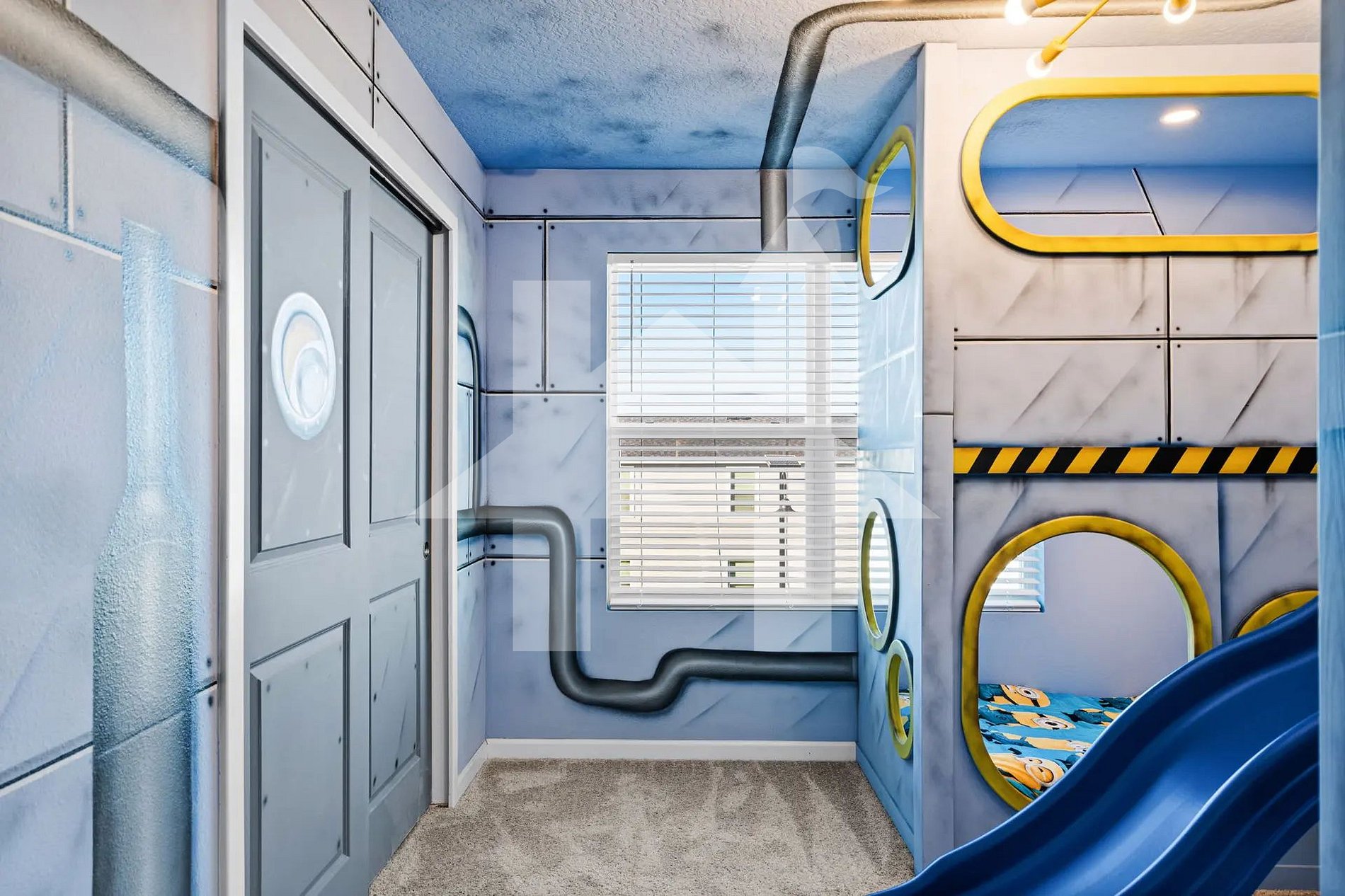 A apenas 15 minutos da Disney, esta villa de 6 quartos e 4,5 banheiros no Solara Resort acomoda até 14 hóspedes com piscina e spa privativos aquecidos, quartos temáticos (Minions, Harry Potter, A Pequena Sereia), game room Mario Bros e home theater Avengers. Cozinha completa, lavanderia, WiFi grátis, estacionamento e estrutura de resort com surf‑simulador, clubhouse e academia. Perfeita para famílias e grupos que buscam diversão e conforto.