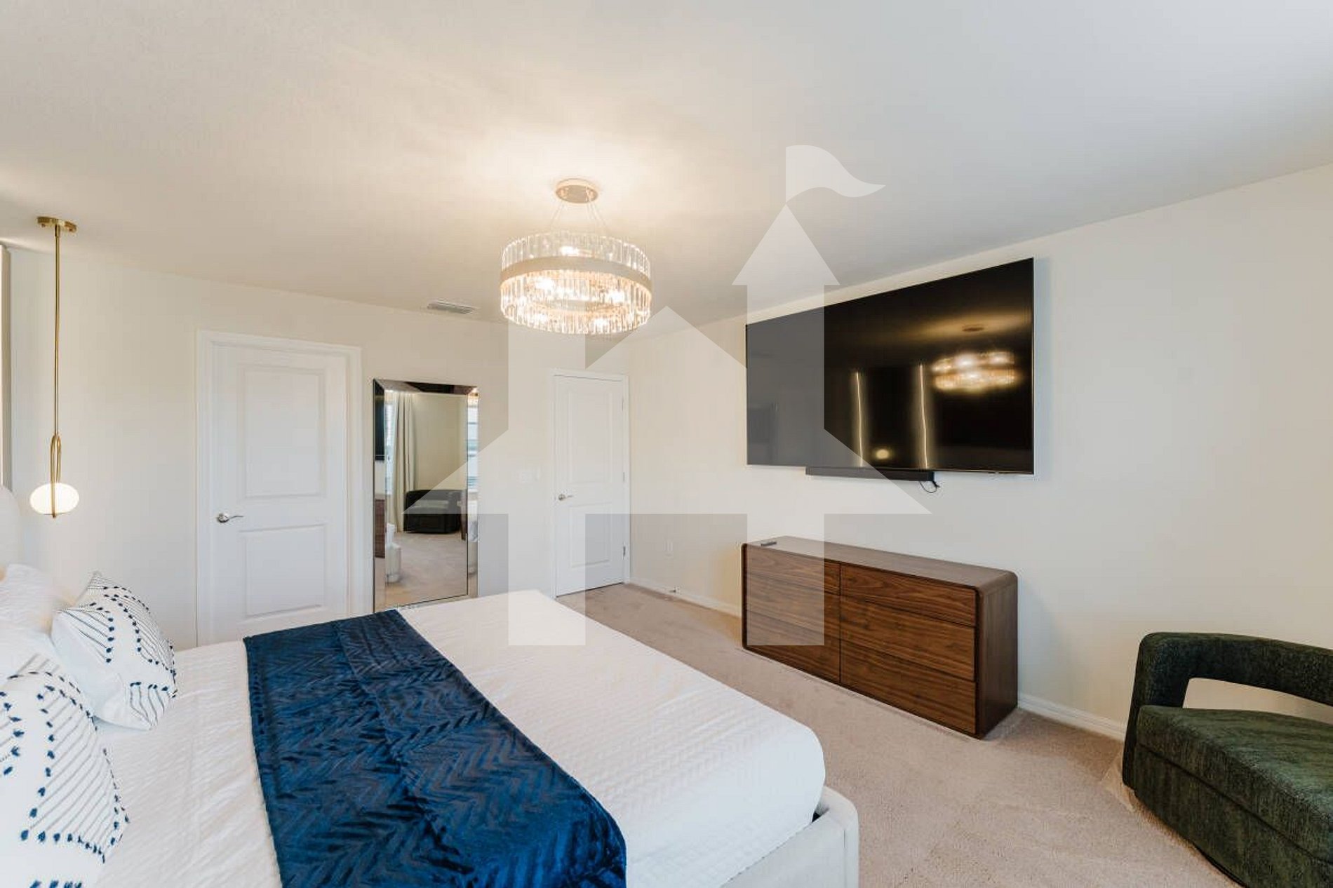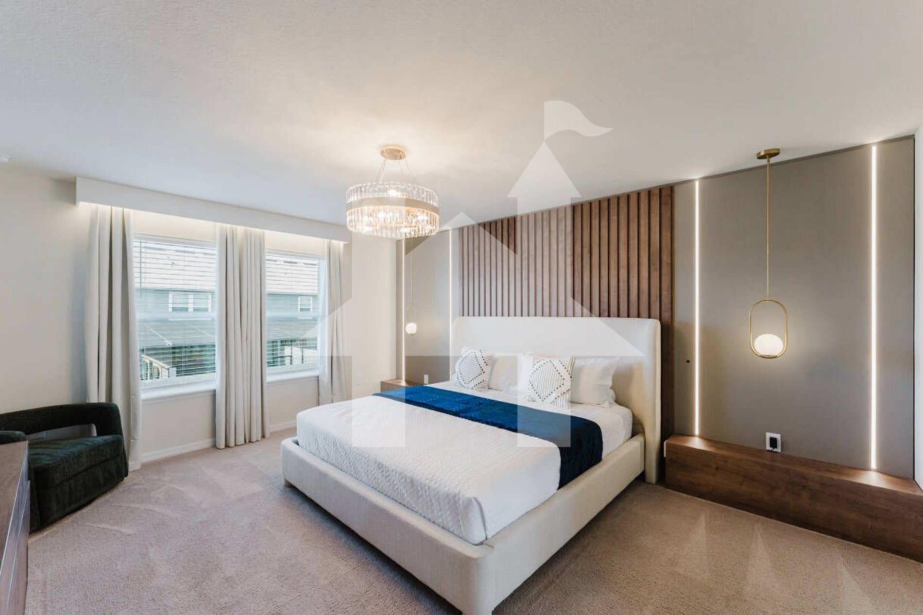 Casa moderna com 5 quartos, 4,5 banheiros e 2.265 sq ft, localizada no Windsor Island Resort, a poucos minutos da Disney. Sala ampla com TV, mesa p/ 8 e balcão p/ 4, cozinha completa. No andar superior: loft com TV smart e PS5. Quartos: 2 king, 1 queen, beliches temáticos (Princesas e Toy Story). Wi‑Fi grátis, TV a cabo, lavanderia, ar-condicionado central. Piscina privativa aquecível e churrasqueira como extras.